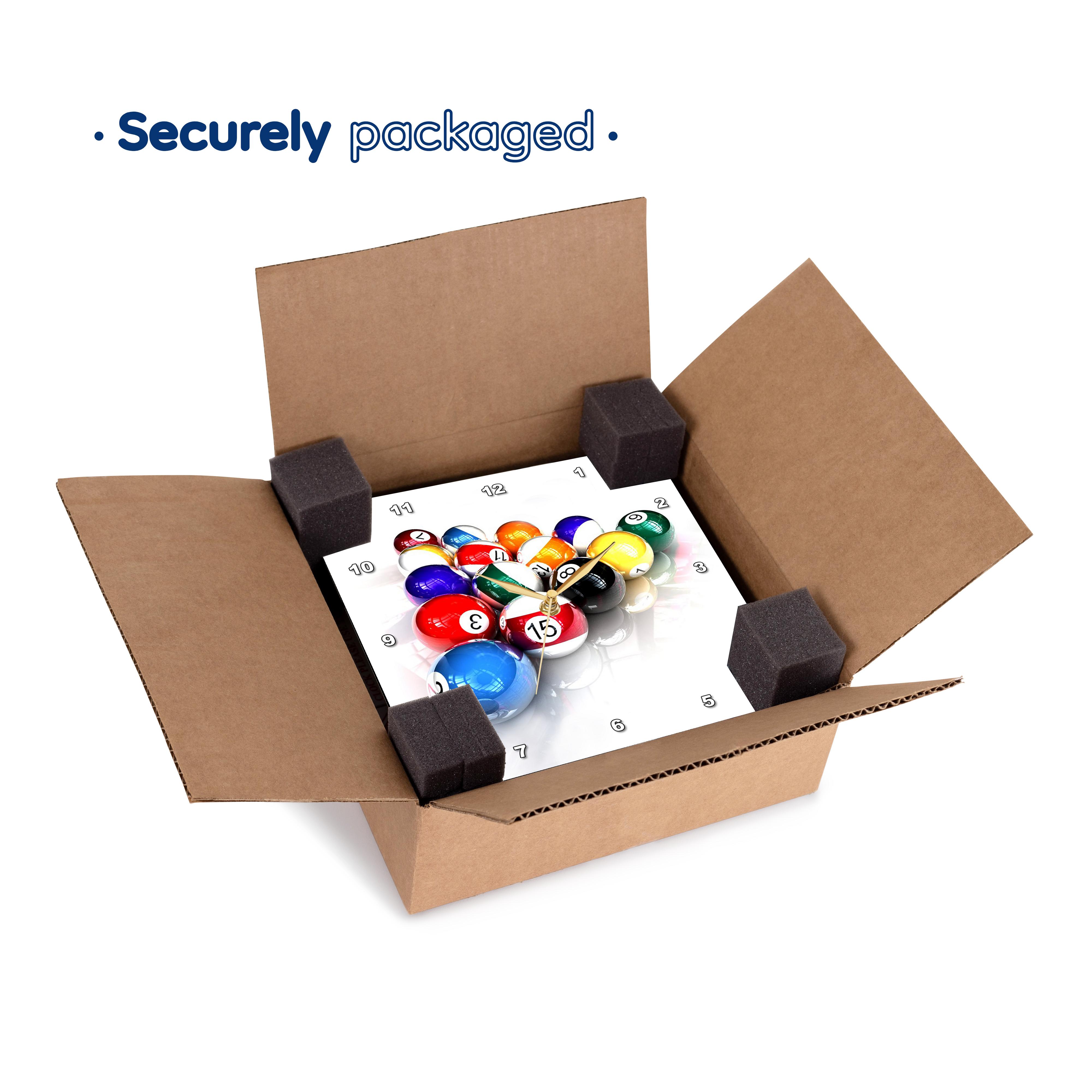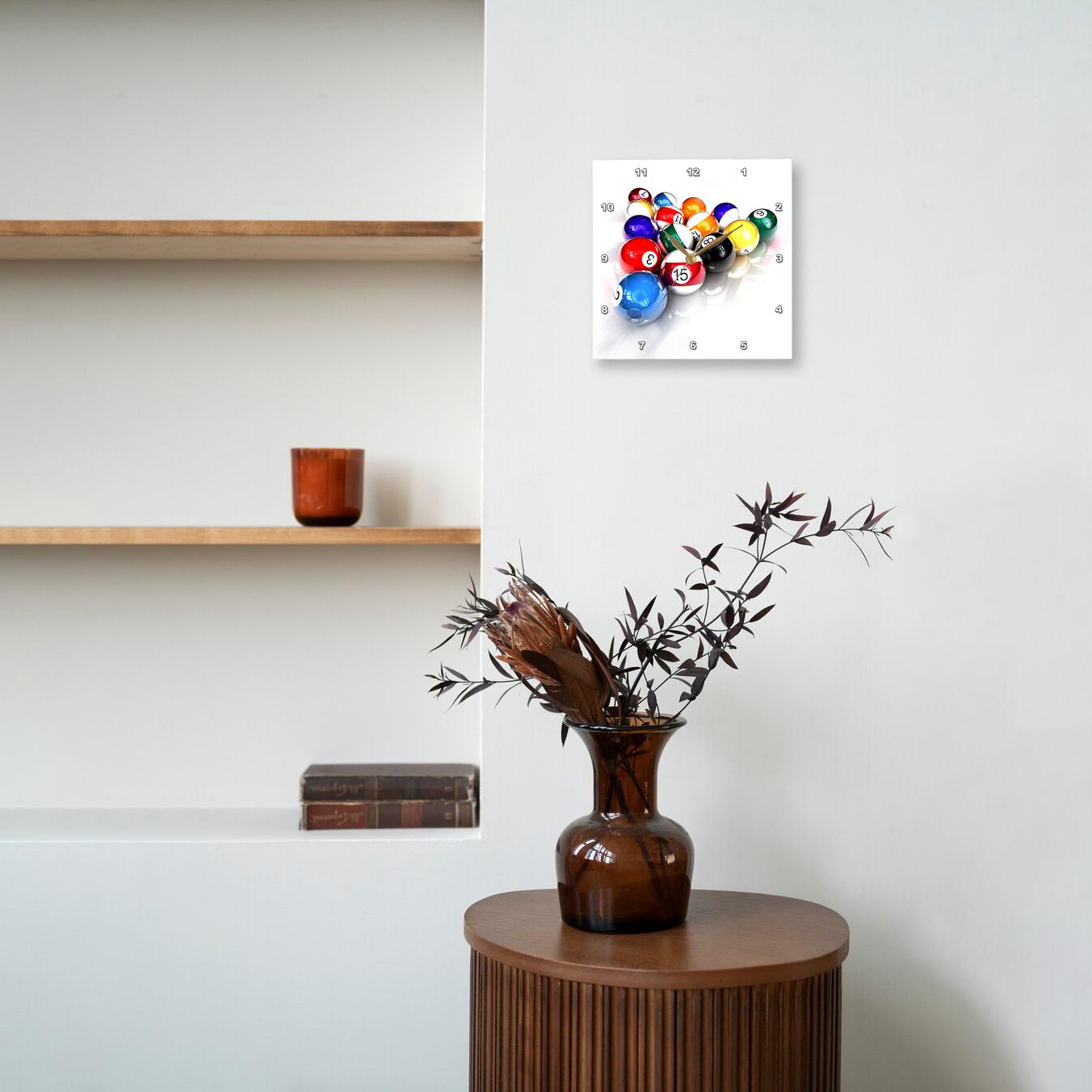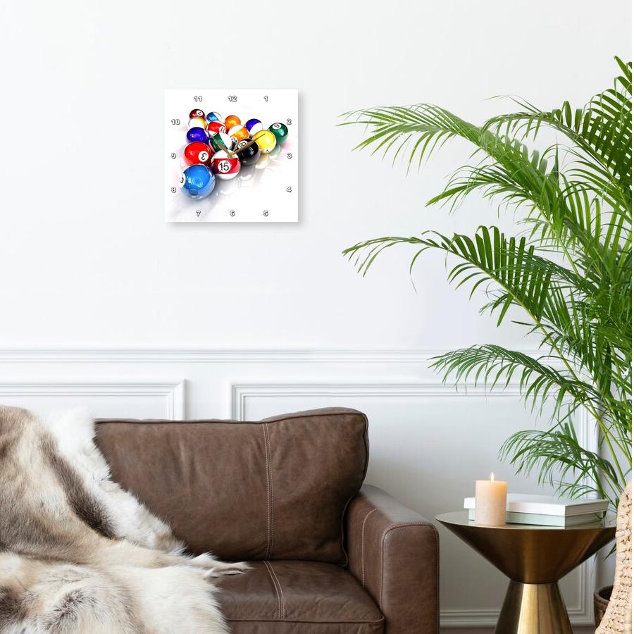 Billiards Balls Pool Wall Clock is a wonderful complement to any room in your home or office. Made of durable high grade aluminum. This frame-less clock has a high gloss mirror like, UV coated, scratch resistant finish and is suitable for a moist environment. Sizes available range from 10" x 10" to 15" x 15". Requires one AA battery; not included. Battery box is not covered. Made in USA.