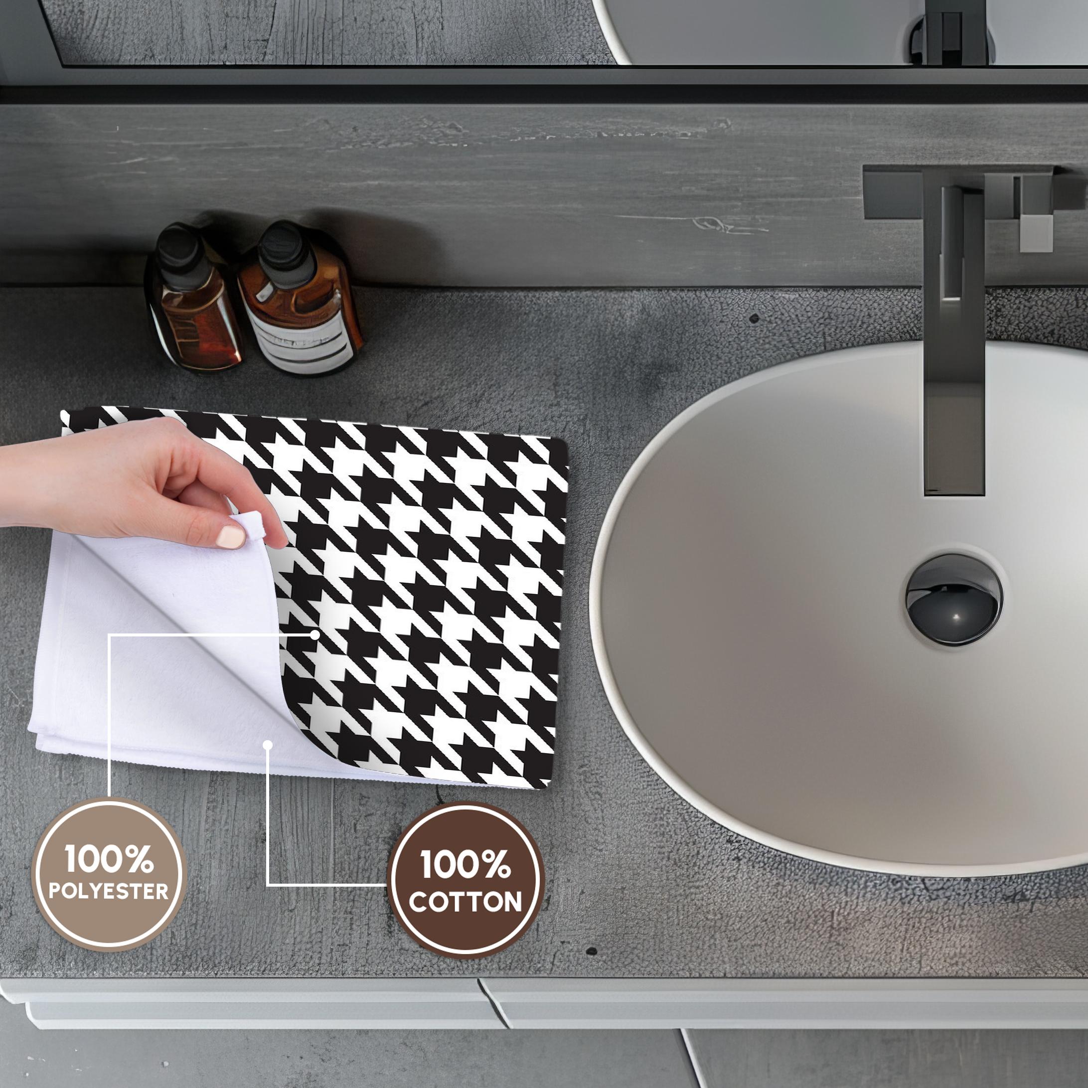 Black And White Classic Preppy Houndstooth Pattern Towel is great to use in the kitchen, bathroom or gym. This 15 by 22 inch, hand/sports towel allows you to customize your room with a special design or color. Great for drying dishes, hands and faces. Suitable to put in any sports bag. Image will not fade after washing. Machine wash, tumble dry low, do not bleach. Towel will regain its fullness after the first washing. Made of: Printed side 100% polyester and reverse side 100% Terrycloth cotton. Image printed on polyester side/ terry cloth side is blank white.