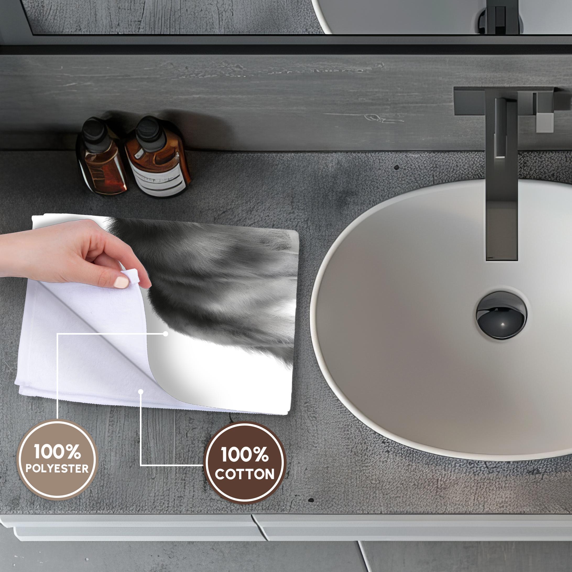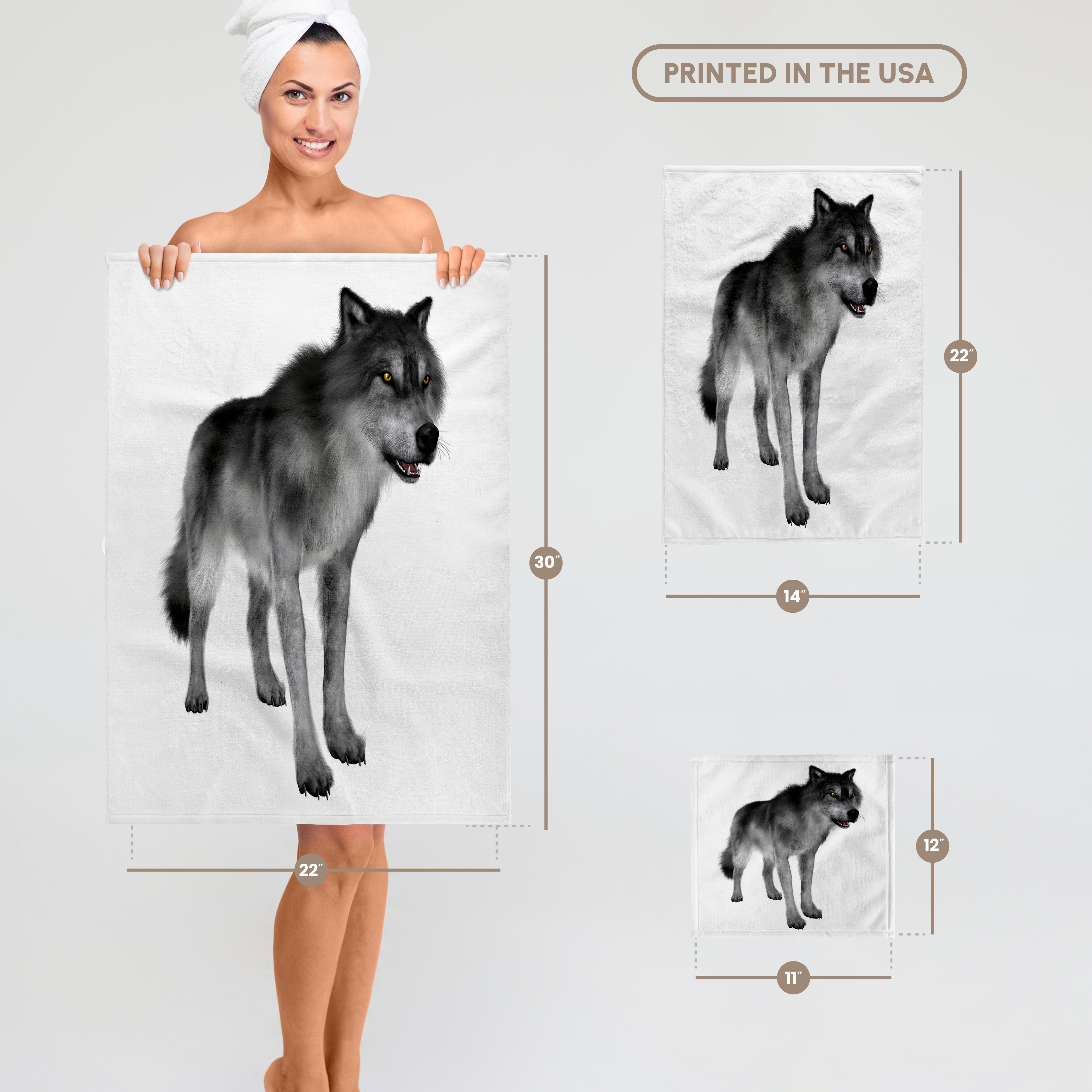 Grey Wolf Towel is great to use in the kitchen, bathroom or gym. This 15 by 22 inch, hand/sports towel allows you to customize your room with a special design or color. Great for drying dishes, hands and faces. Suitable to put in any sports bag. Image will not fade after washing. Machine wash, tumble dry low, do not bleach. Towel will regain its fullness after the first washing. Made of: Printed side 100% polyester and reverse side 100% Terrycloth cotton. Image printed on polyester side/ terry cloth side is blank white.