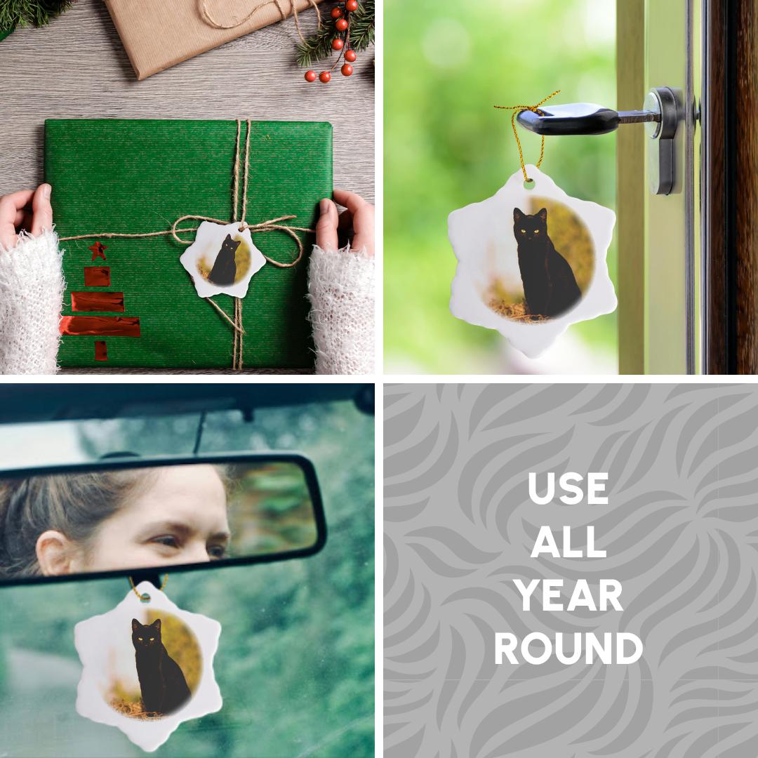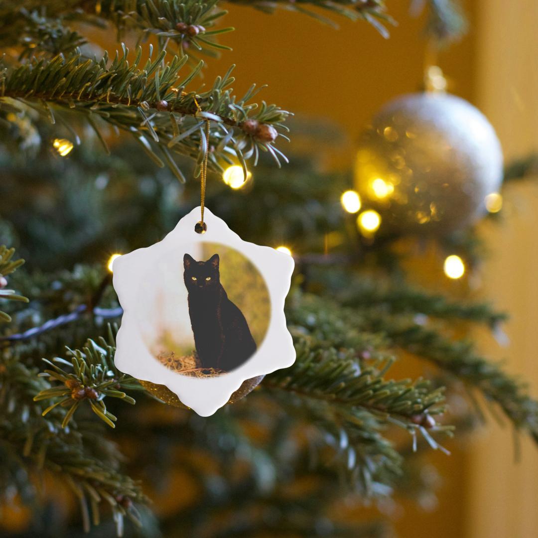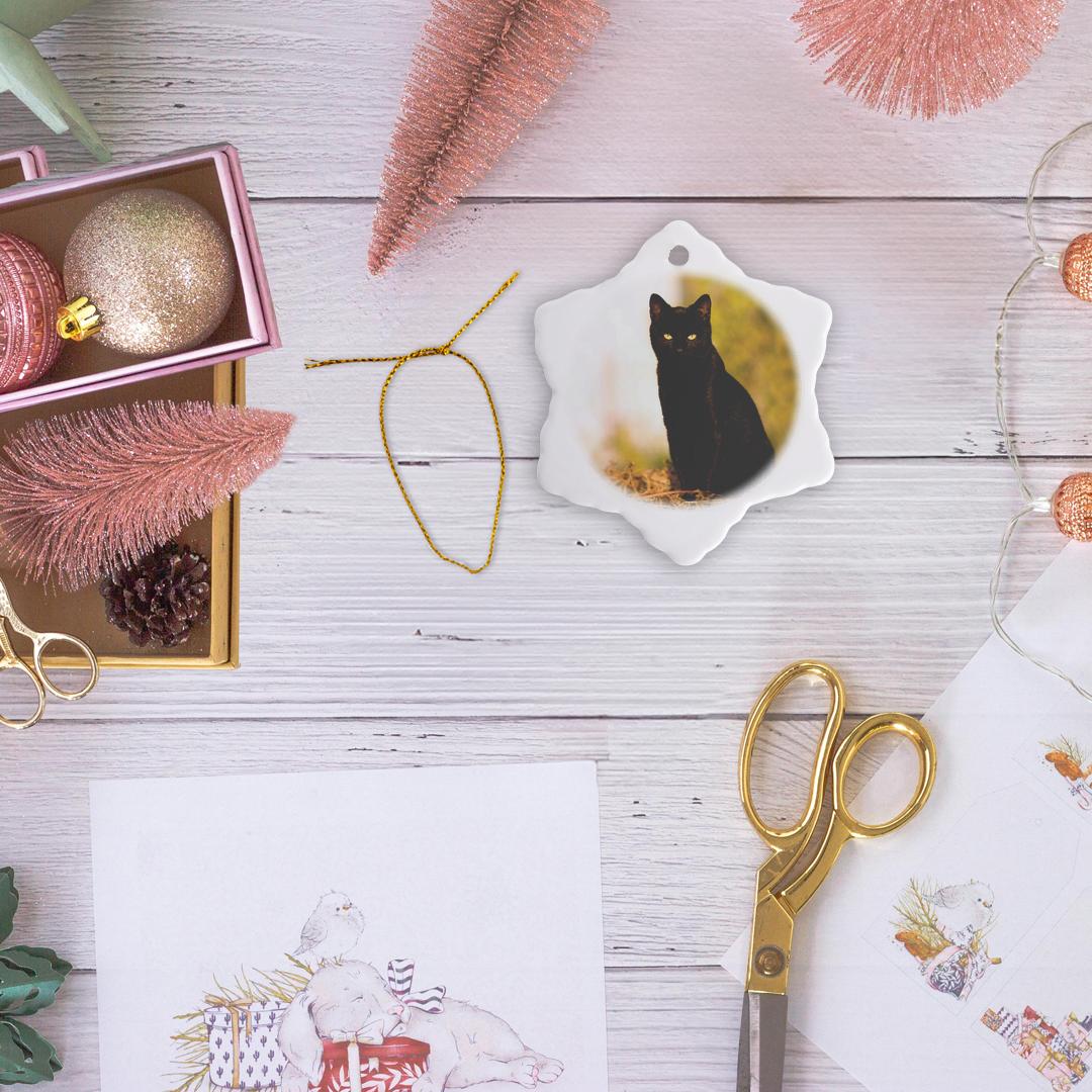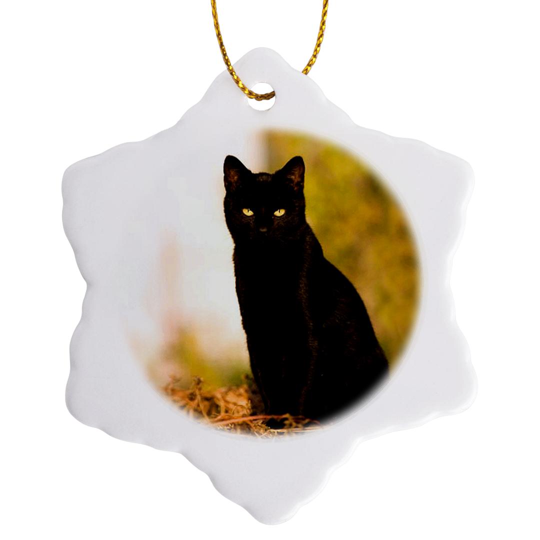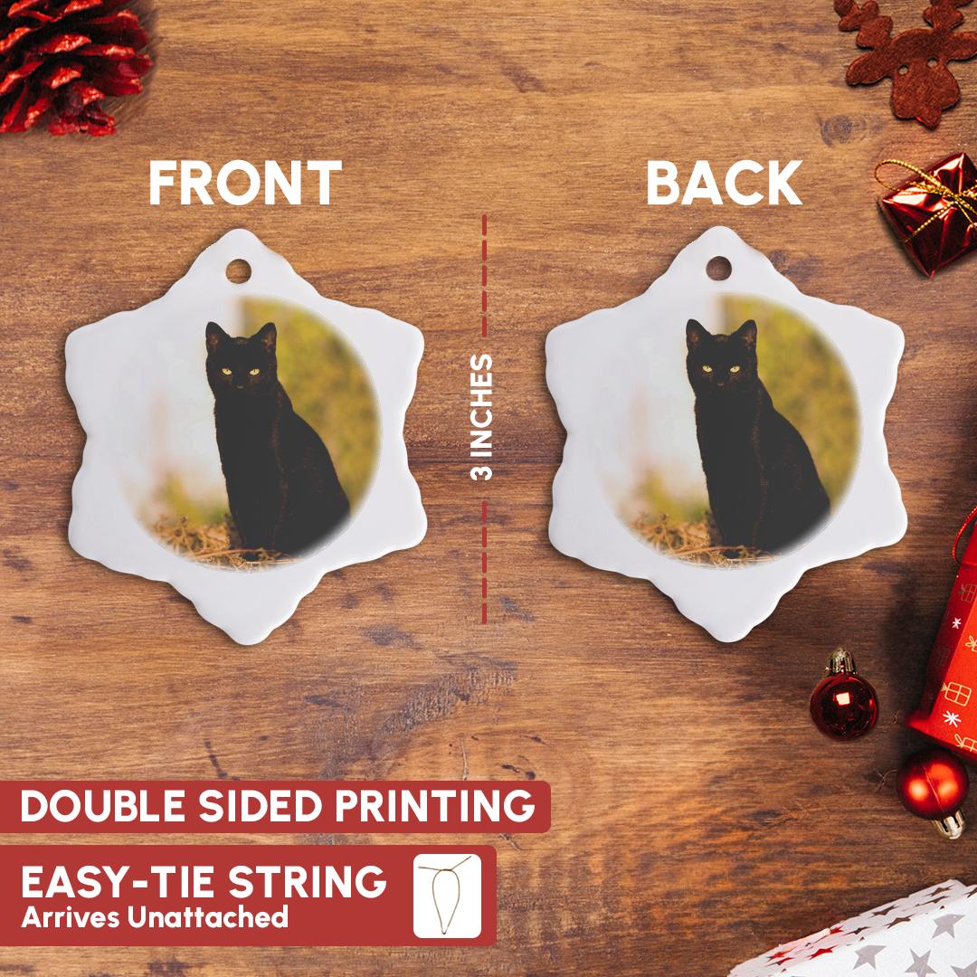 Black Cat Ornament is a perfect addition to your tree or as a window decoration. This glossy porcelain ornament is a great gift for family and friends, commemorating each holiday or special occasion. Image printed on both sides; measures 3 inches. A strand of gold thread makes it easy to display this fantastic keepsake.