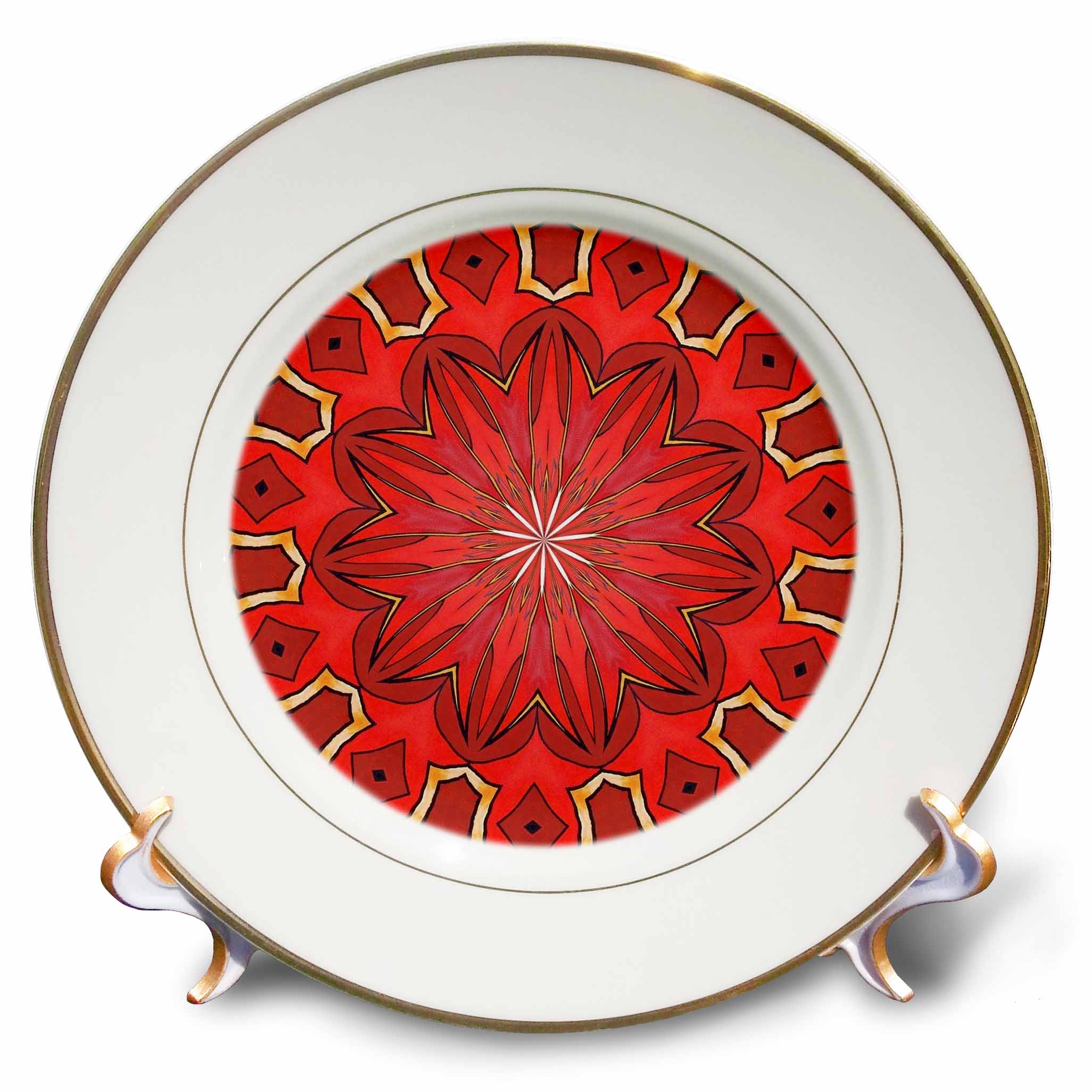 Christmas vibes red bold kaleidoscope pattern mandala Plate is 7.5" in diameter. Made of white porcelain featuring two 24k gold rims. Excellent to give as a gift commemorating a special person or event. Stand included. Decorative use only.