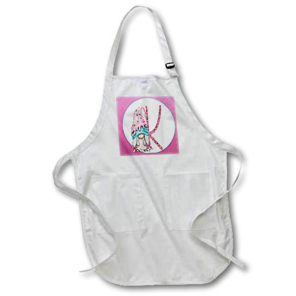 Cute Pink Ice Cream Gnome Pink Image Of Glitter Monogram K Apron is made of a 65/35 poly/cotton blend. Whether it is put to use in a restaurant or at home, this apron will always help to keep you clean. Full length features adjustable neck strap. Medium length features non-adjustable neck strap that fits over your head. Both sizes also tie around the waist.