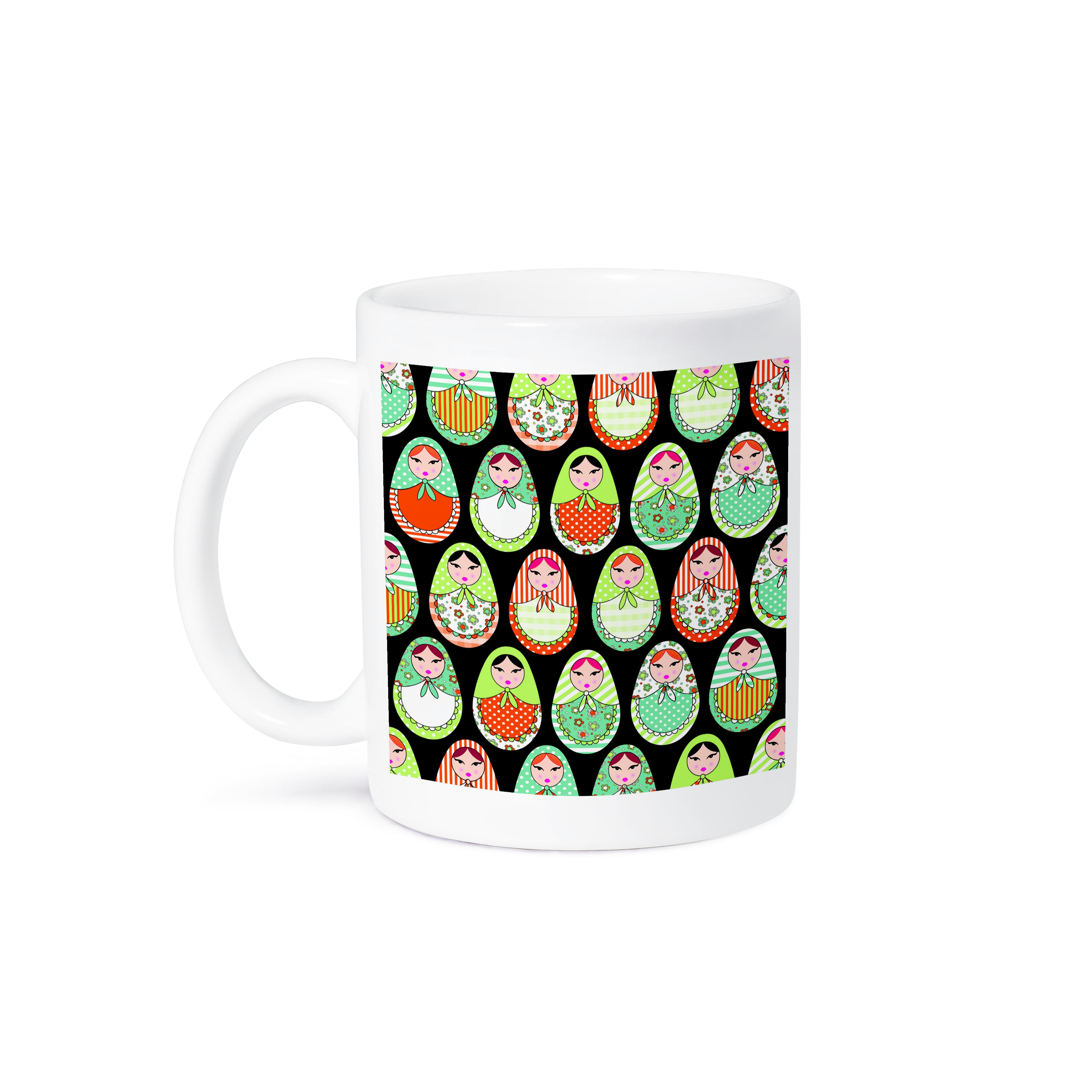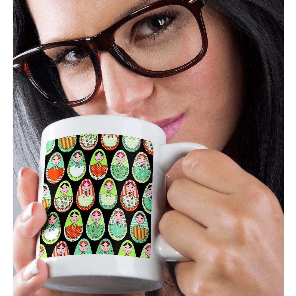 3dRose Cute Russian Matryoshka Nesting Dolls Print - Warm Colors Black - Mugs (mug_58632)