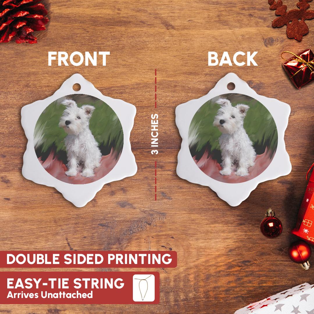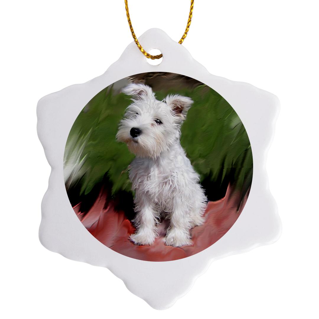 White Schnauzer Ornament is a perfect addition to your tree or as a window decoration. This glossy porcelain ornament is a great gift for family and friends, commemorating each holiday or special occasion. Image printed on both sides; measures 3 inches. A strand of gold thread makes it easy to display this fantastic keepsake.