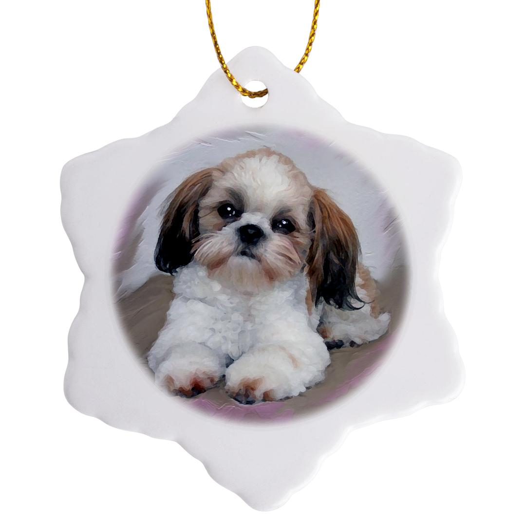 Shih Tzu puppy Ornament is a perfect addition to your tree or as a window decoration. This glossy porcelain ornament is a great gift for family and friends, commemorating each holiday or special occasion. Image printed on both sides; measures 3 inches. A strand of gold thread makes it easy to display this fantastic keepsake.
