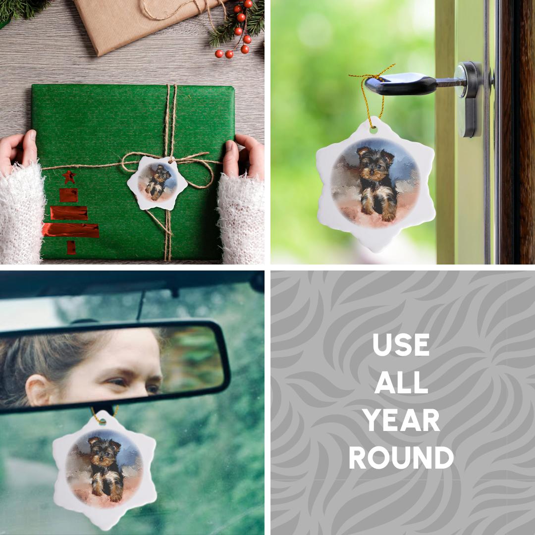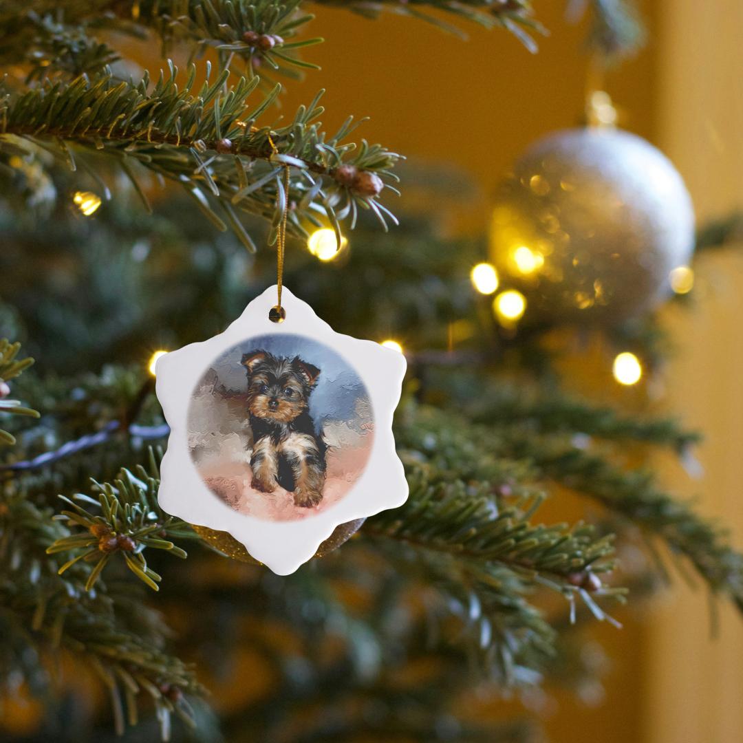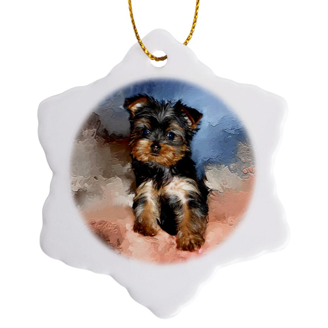 Toy Yorkie Puppy Ornament is a perfect addition to your tree or as a window decoration. This glossy porcelain ornament is a great gift for family and friends, commemorating each holiday or special occasion. Image printed on both sides; measures 3 inches. A strand of gold thread makes it easy to display this fantastic keepsake.