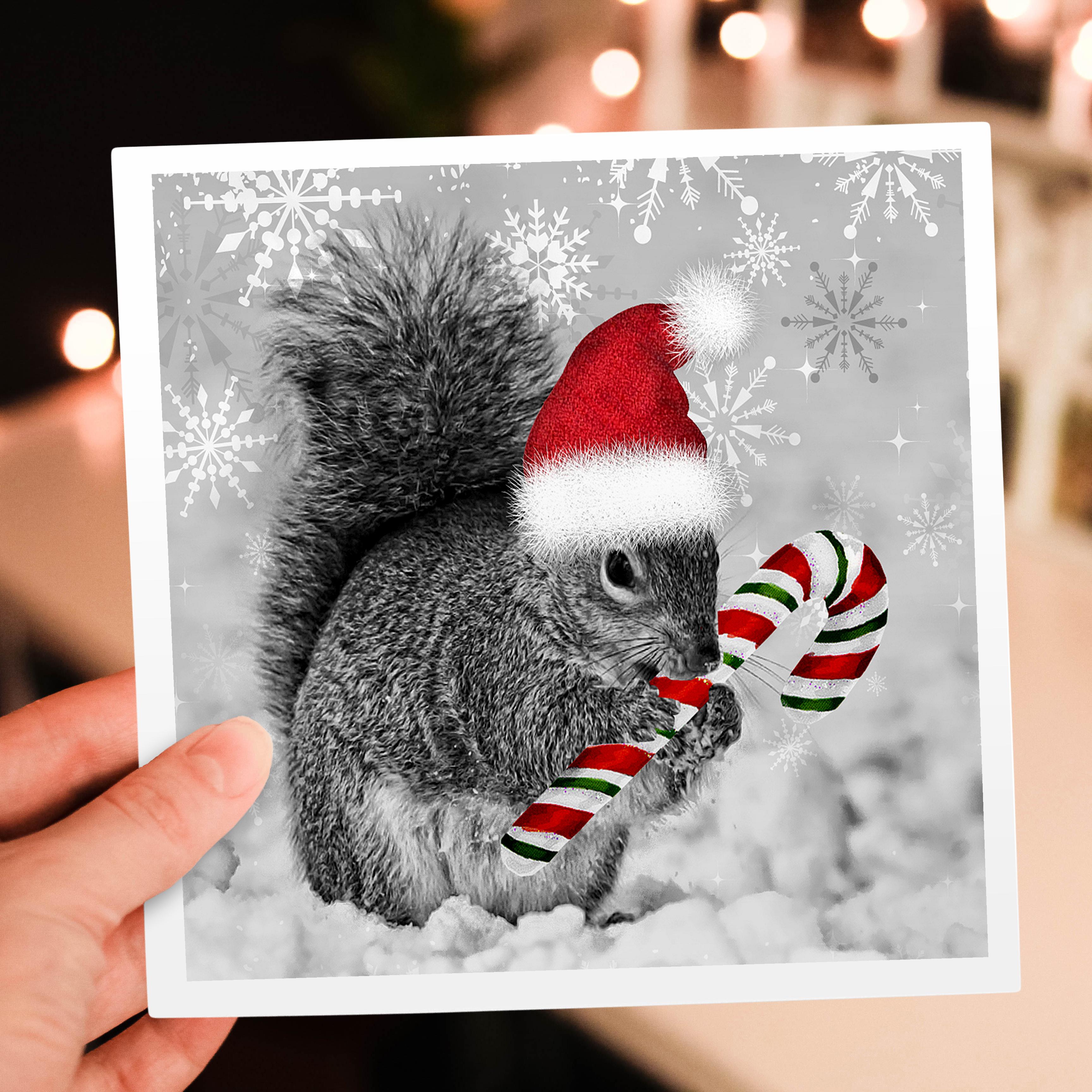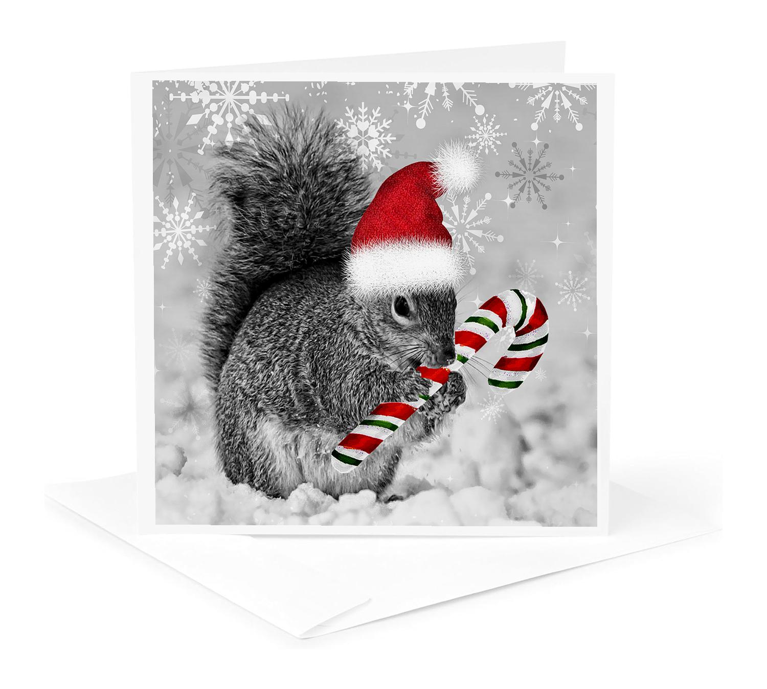 3dRose Doreen Erhardt Christmas Collection - This cute Christmas squirrel has a candy cane and a Santa hat in the snow covered winter landscape. - Greeting Cards (gc_150177)