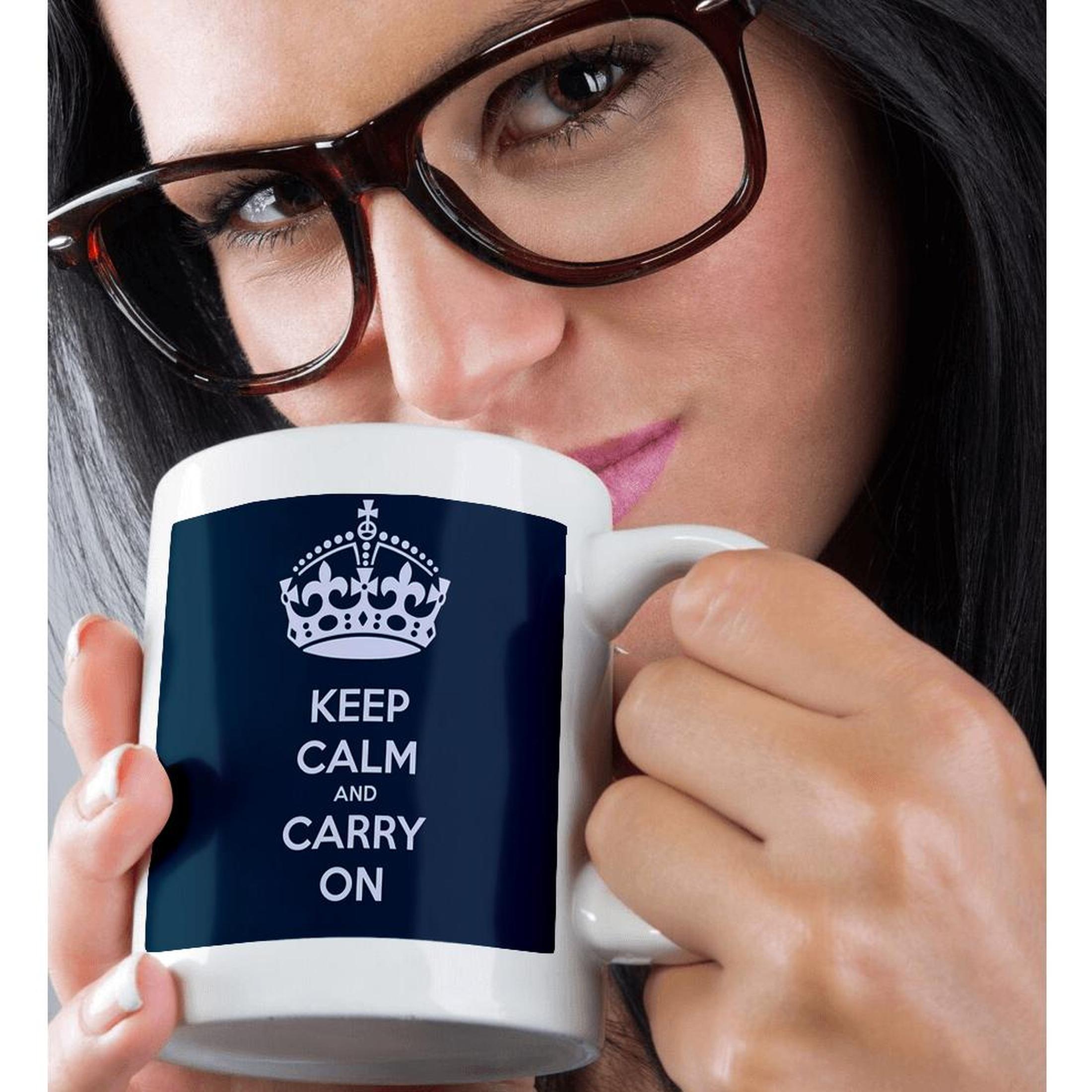 Keep calm and carry on. Navy. Mug is available in both 11 oz and 15 oz. Why drink out of an ordinary mug when a custom printed mug is so much cooler? This ceramic mug is lead free, microwave safe. Image is printed on both sides. Hand washing is recommended.