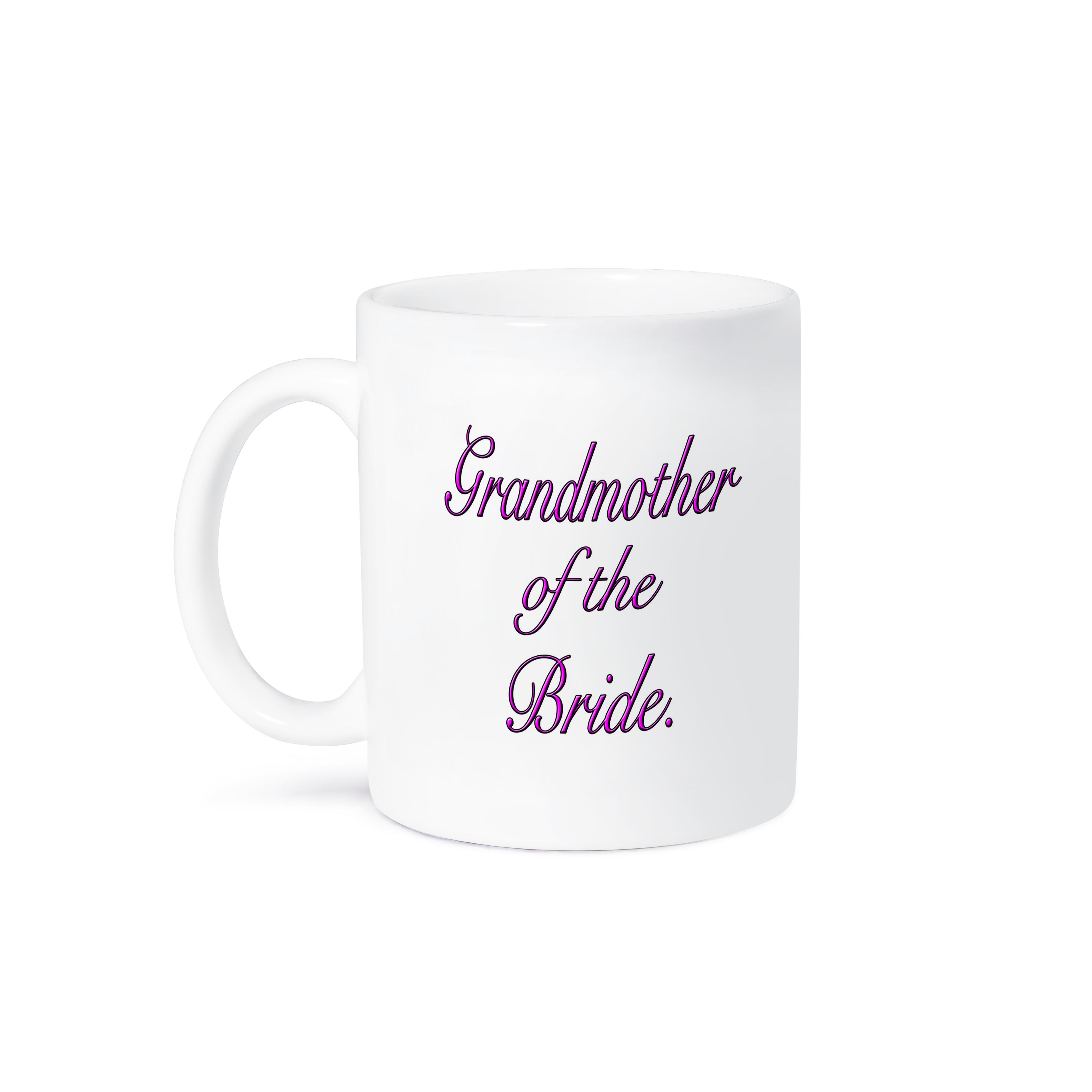 Grandmother of the Bride, Pink Mug is available in both 11 oz and 15 oz. Why drink out of an ordinary mug when a custom printed mug is so much cooler? This ceramic mug is lead free, microwave safe. Image is printed on both sides. Hand washing is recommended.