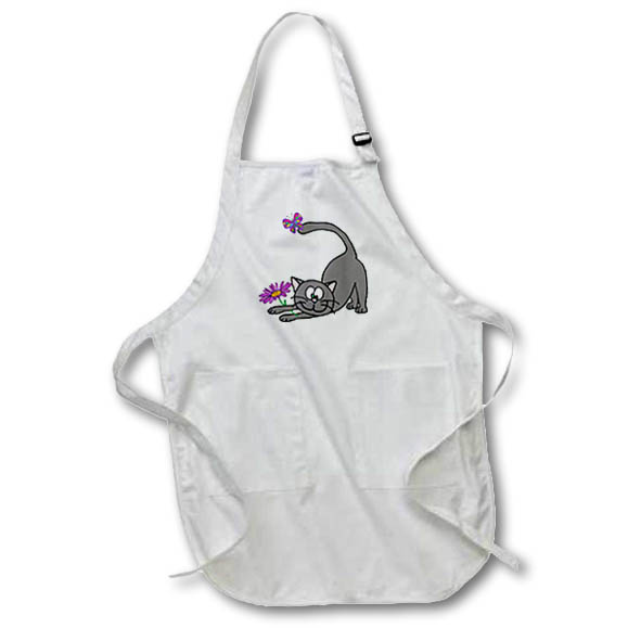 Apron - Funny Blue Grey Playful Kitty Cat with Purple Daisy Flower Cartoon Pets