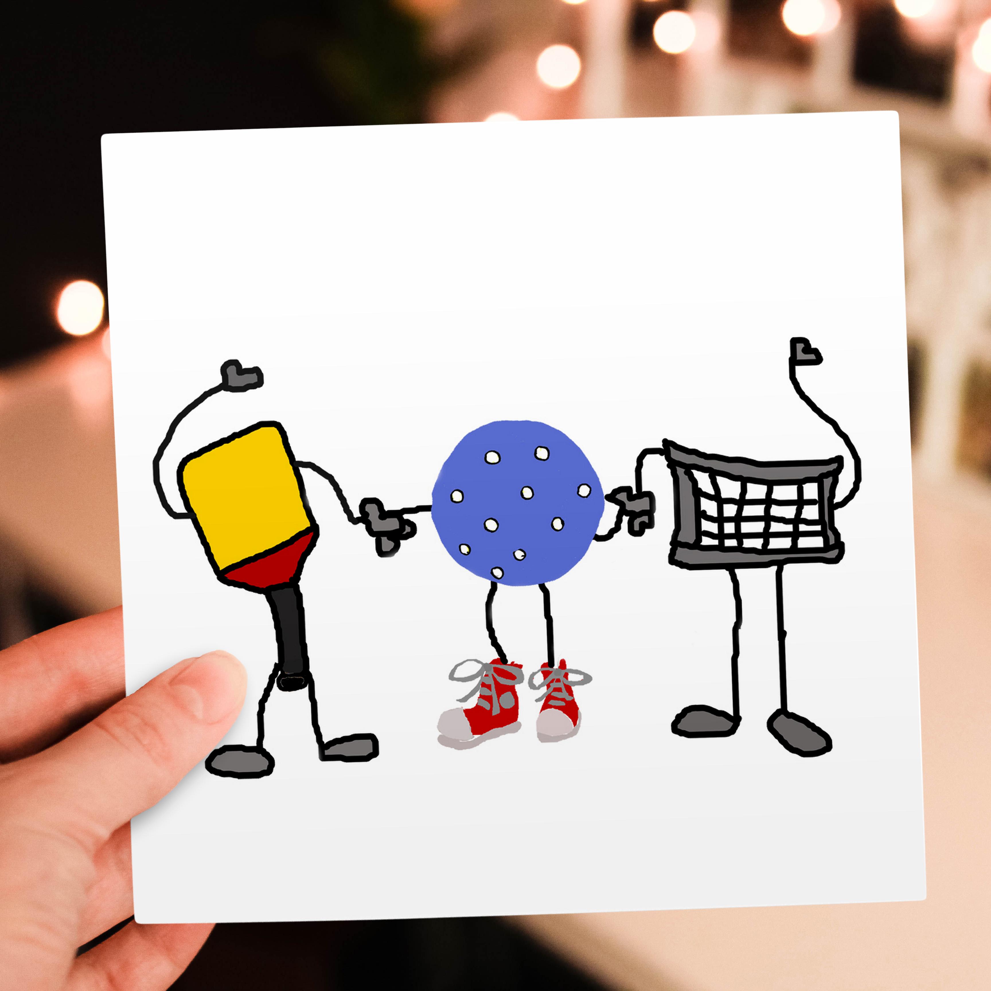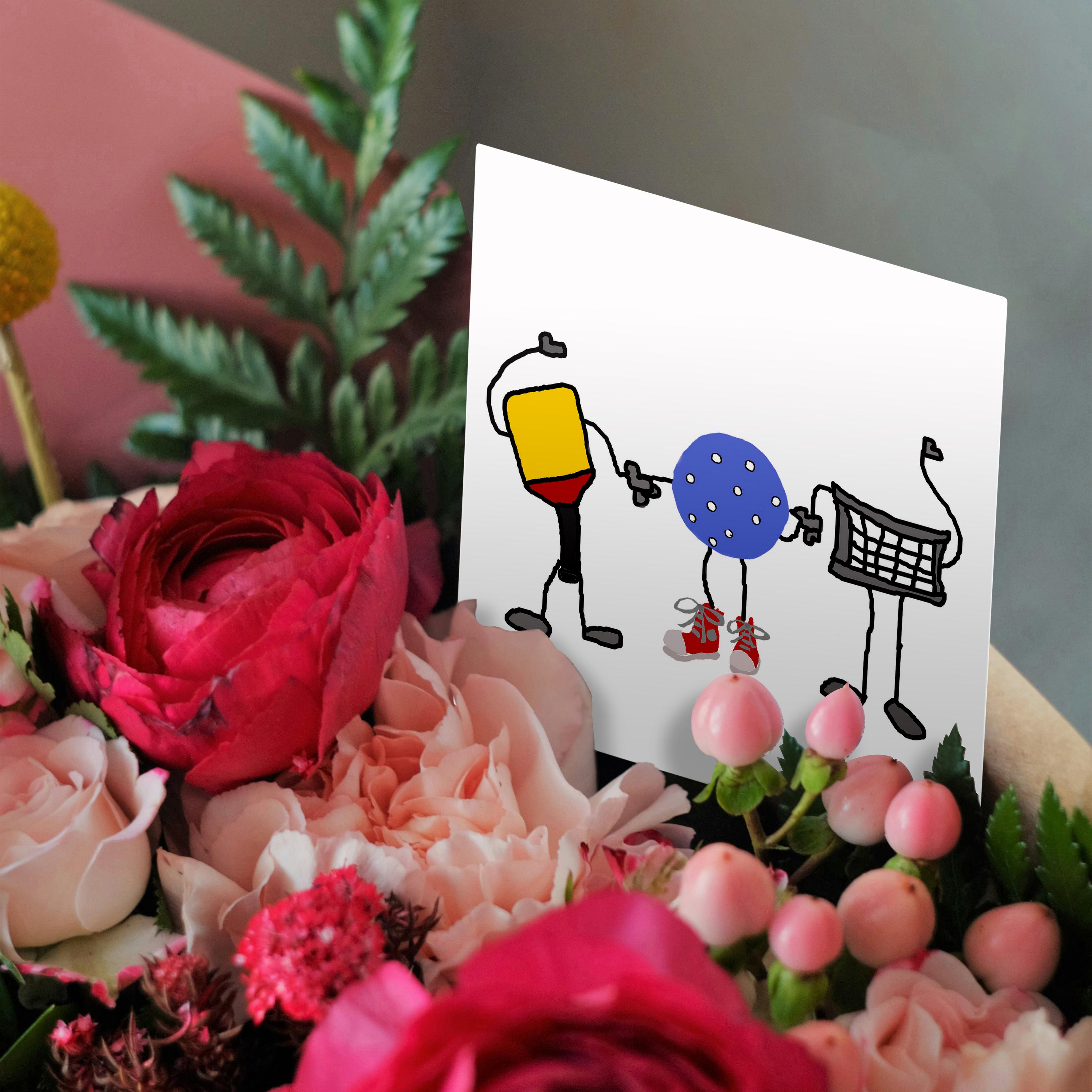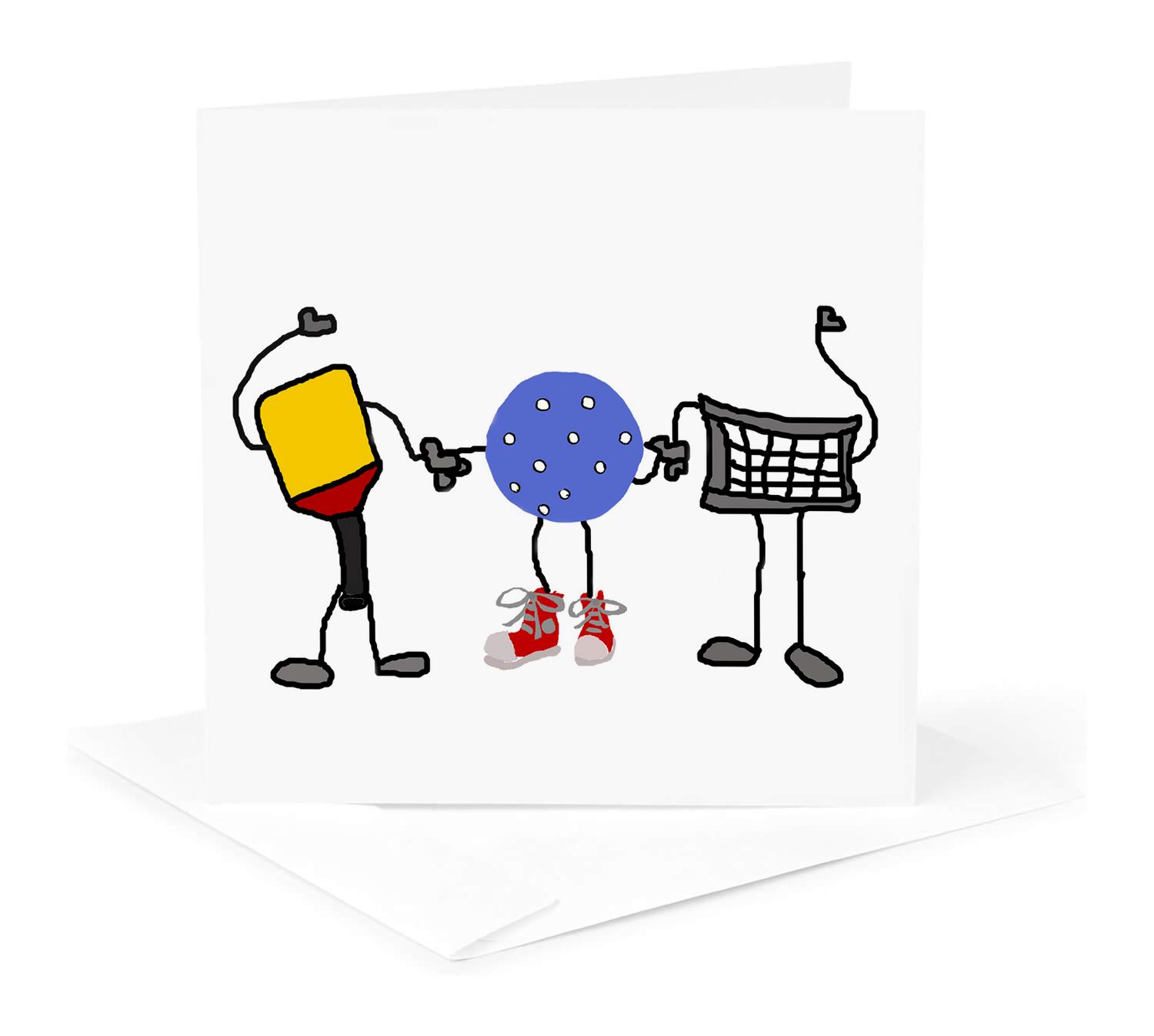 3dRose Funny Pickleball Paddle, Ball, and Net Cartoon Characters - Greeting Cards (gc_263839)