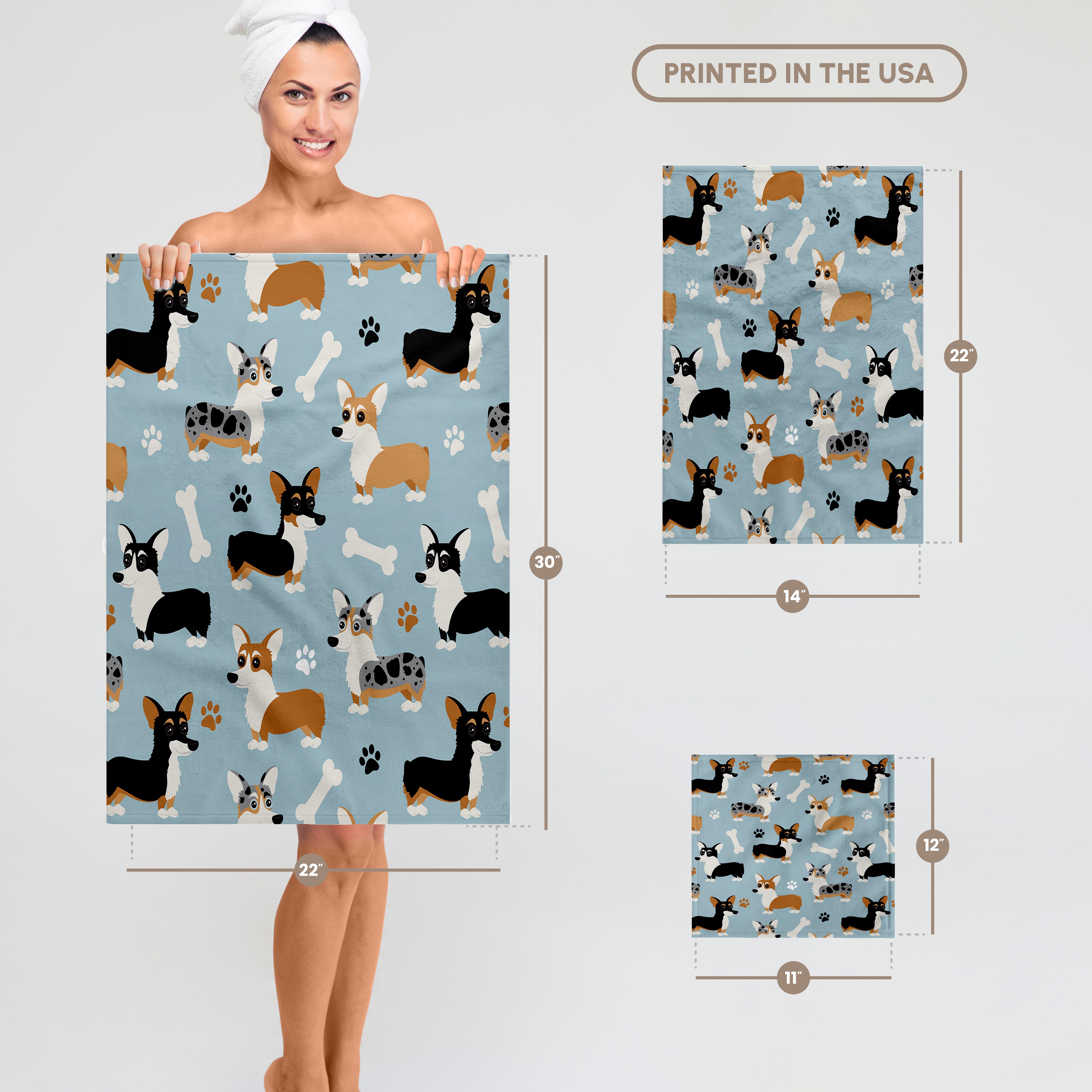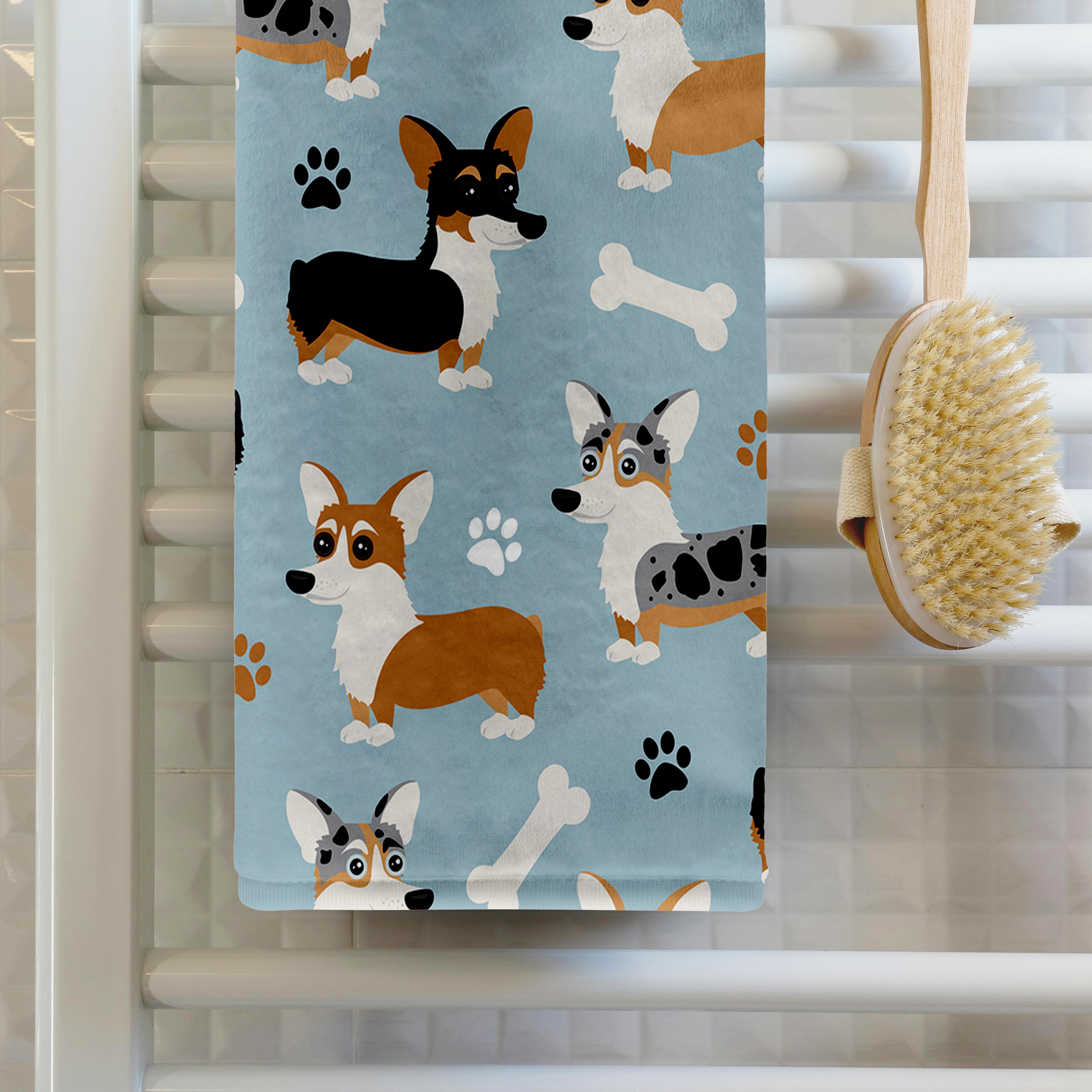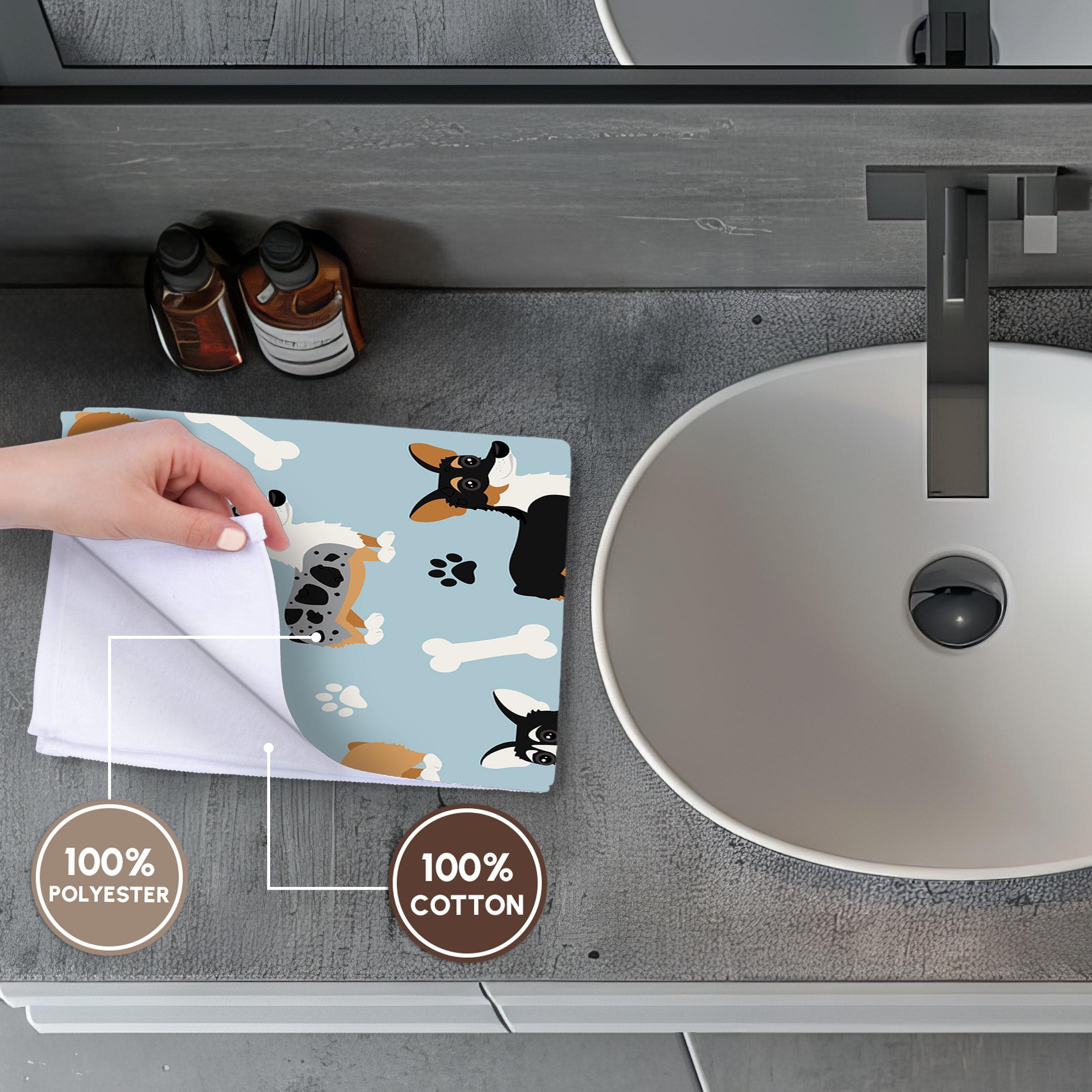 Cute Corgi Dog Pattern Blue Towel is great to use in the kitchen, bathroom or gym. This 15 by 22 inch, hand/sports towel allows you to customize your room with a special design or color. Great for drying dishes, hands and faces. Suitable to put in any sports bag. Image will not fade after washing. Machine wash, tumble dry low, do not bleach. Towel will regain its fullness after the first washing. Made of: Printed side 100% polyester and reverse side 100% Terrycloth cotton. Image printed on polyester side/ terry cloth side is blank white.