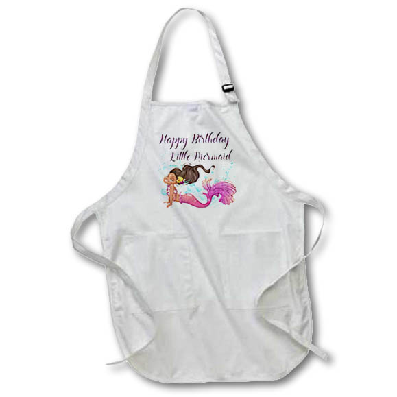 Happy Birthday Little Mermaid With A Cute Mermaid In Pink Apron is made of a 65/35 poly/cotton blend. Whether it is put to use in a restaurant or at home, this apron will always help to keep you clean. Full length features adjustable neck strap. Medium length features non-adjustable neck strap that fits over your head. Both sizes also tie around the waist.