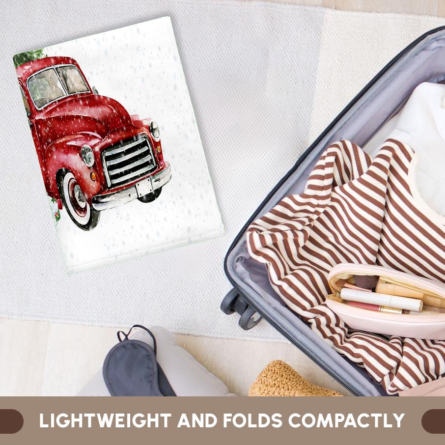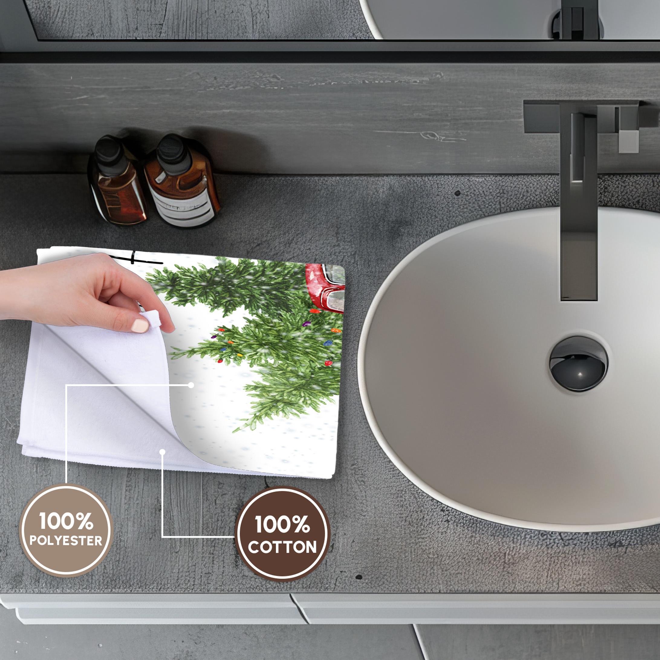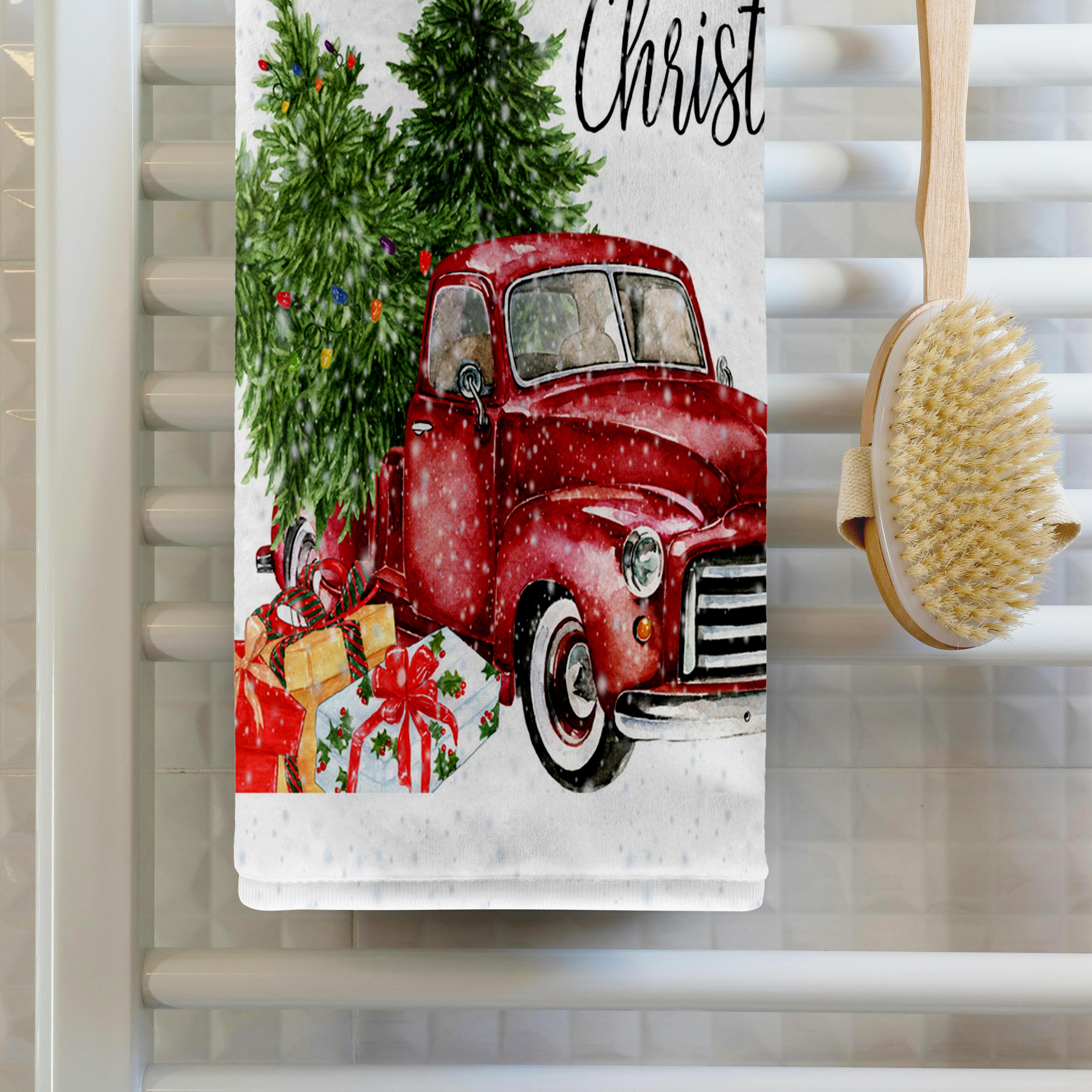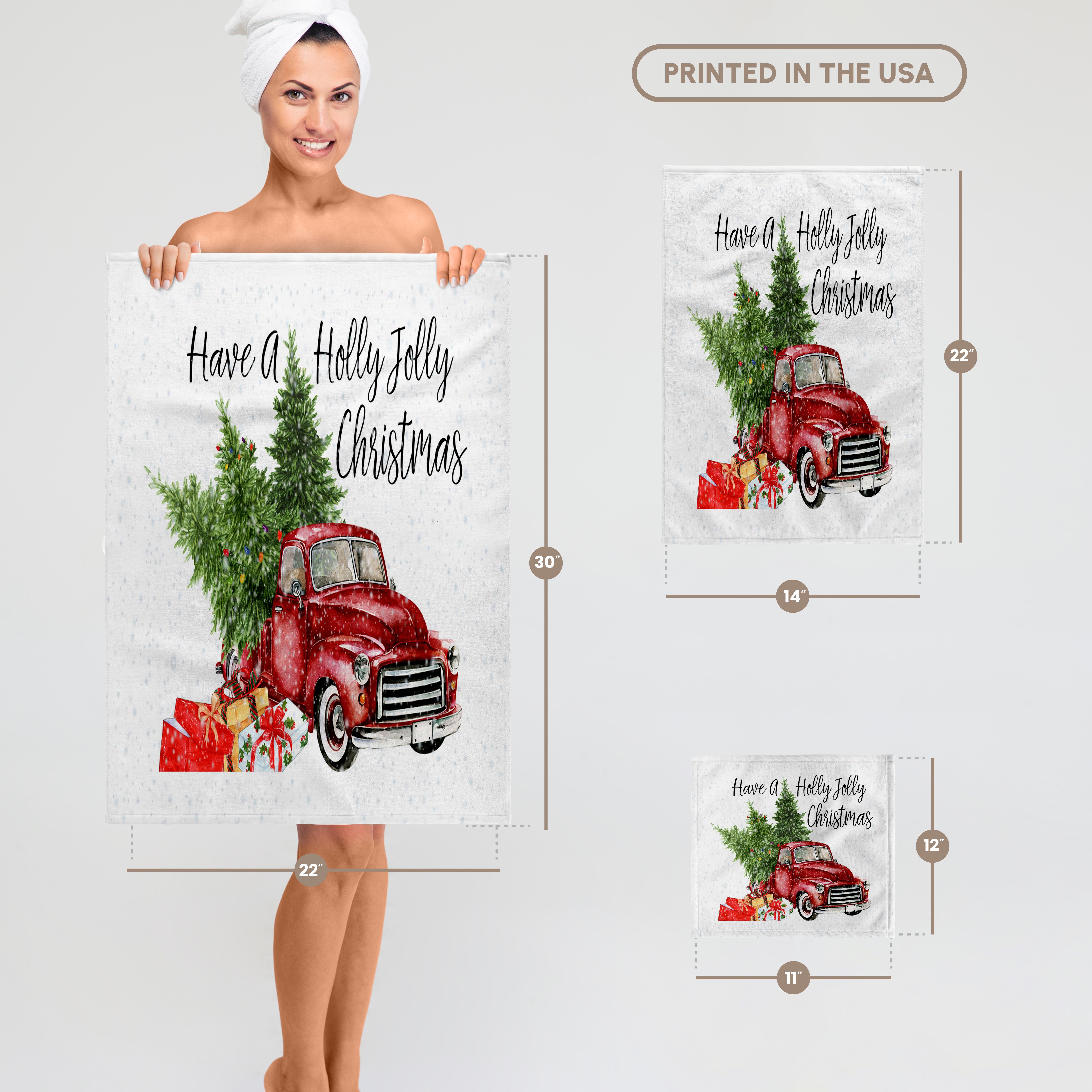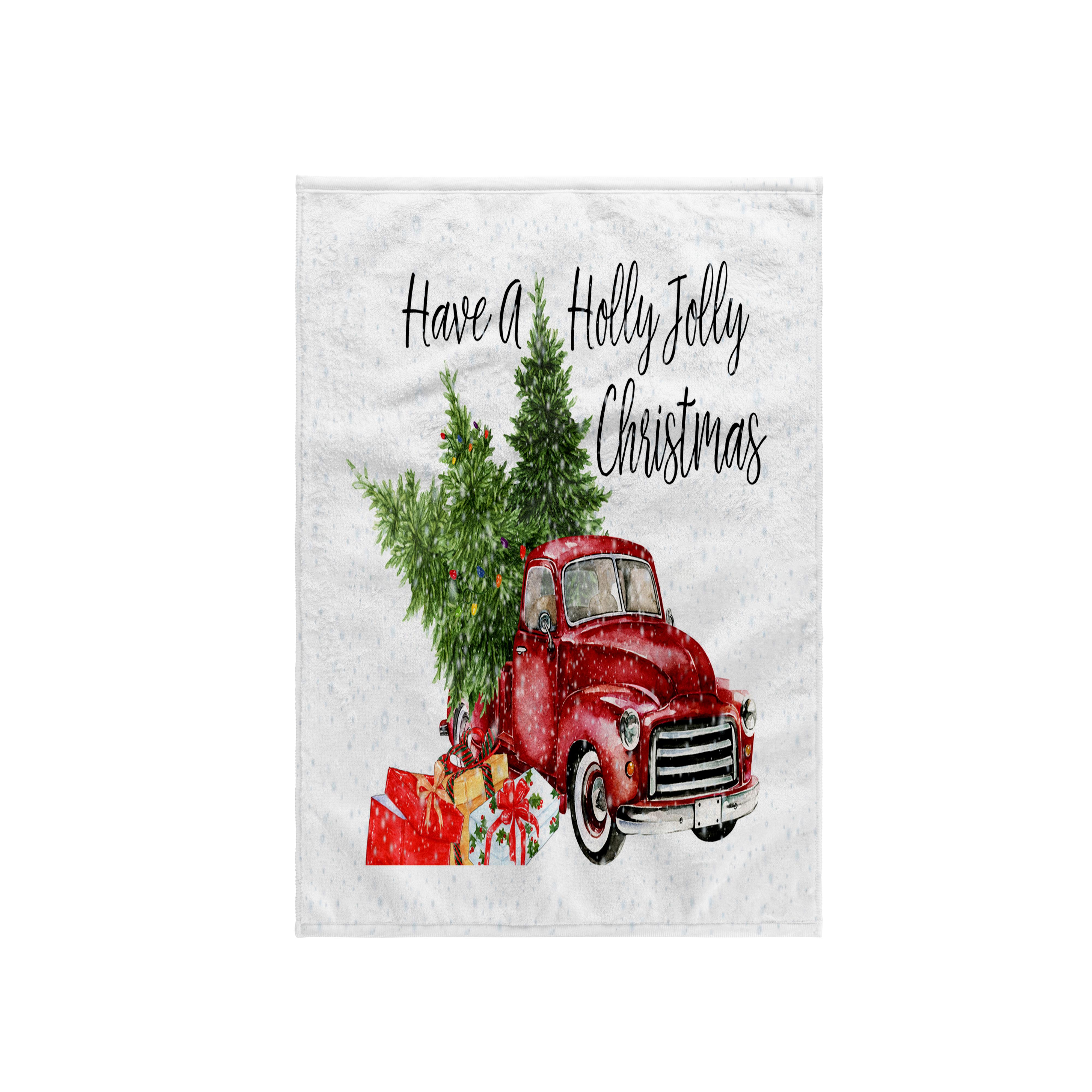 Have A Holly Jolly Christmas Red Truck With Christmas Trees Towel is great to use in the kitchen, bathroom or gym. This 15 by 22 inch, hand/sports towel allows you to customize your room with a special design or color. Great for drying dishes, hands and faces. Suitable to put in any sports bag. Image will not fade after washing. Machine wash, tumble dry low, do not bleach. Towel will regain its fullness after the first washing. Made of: Printed side 100% polyester and reverse side 100% Terrycloth cotton. Image printed on polyester side/ terry cloth side is blank white.