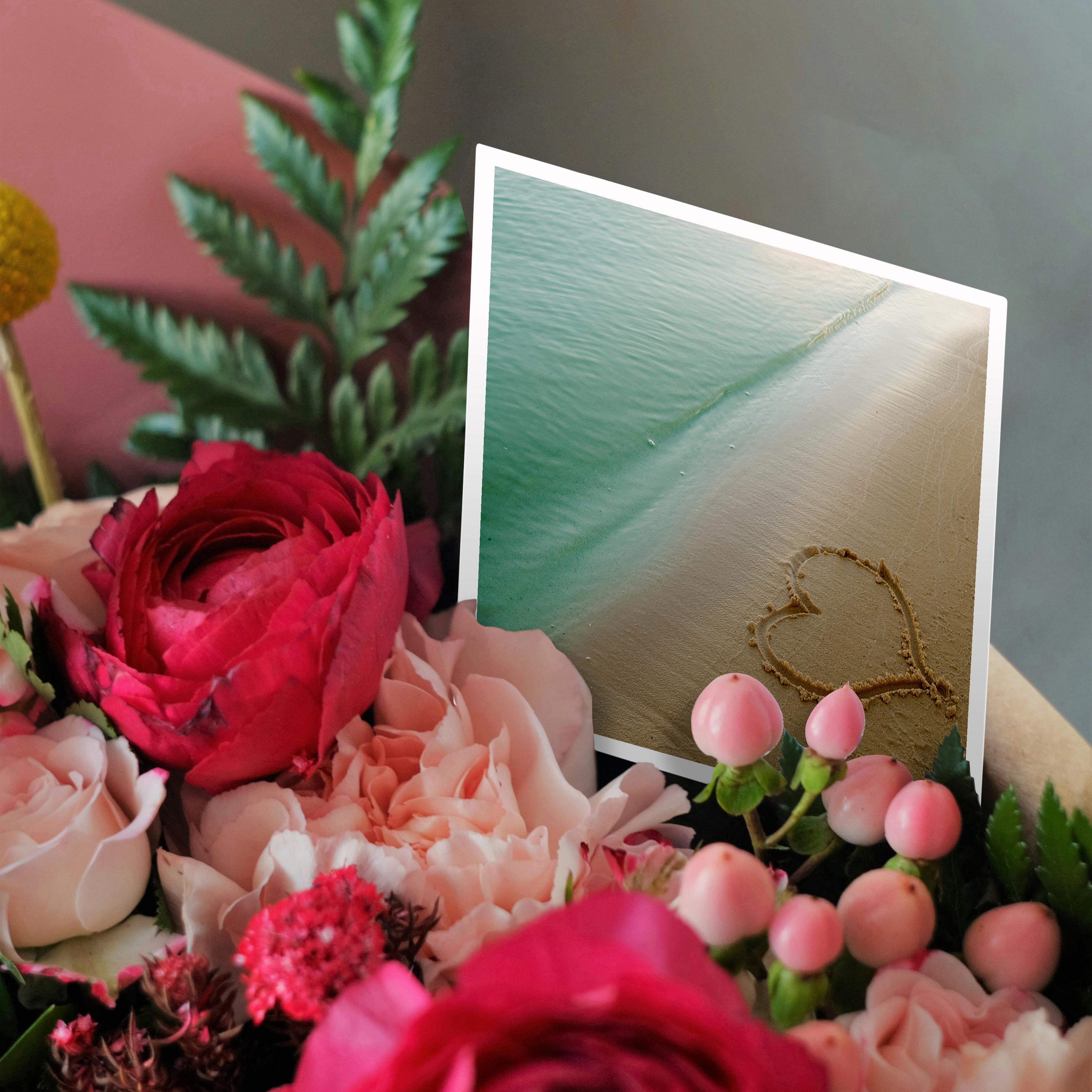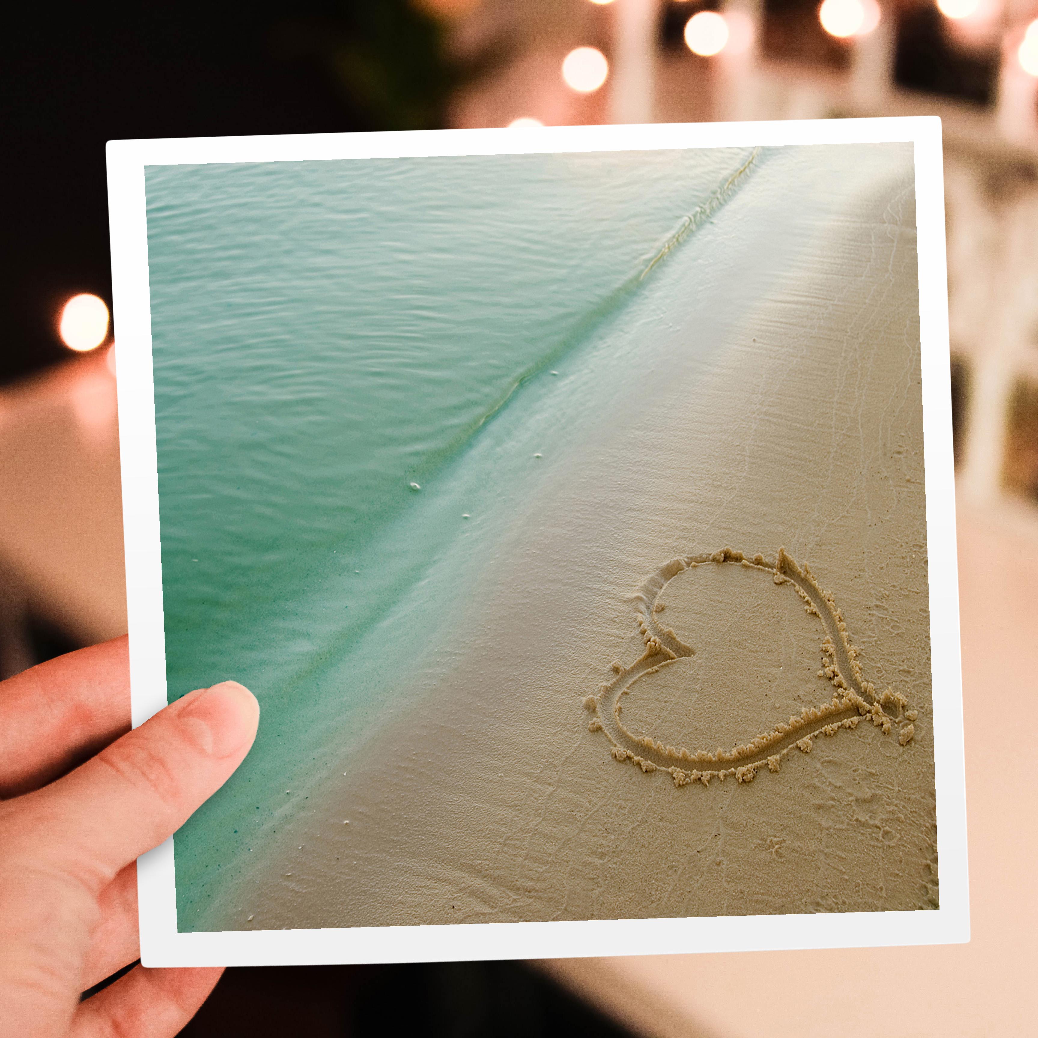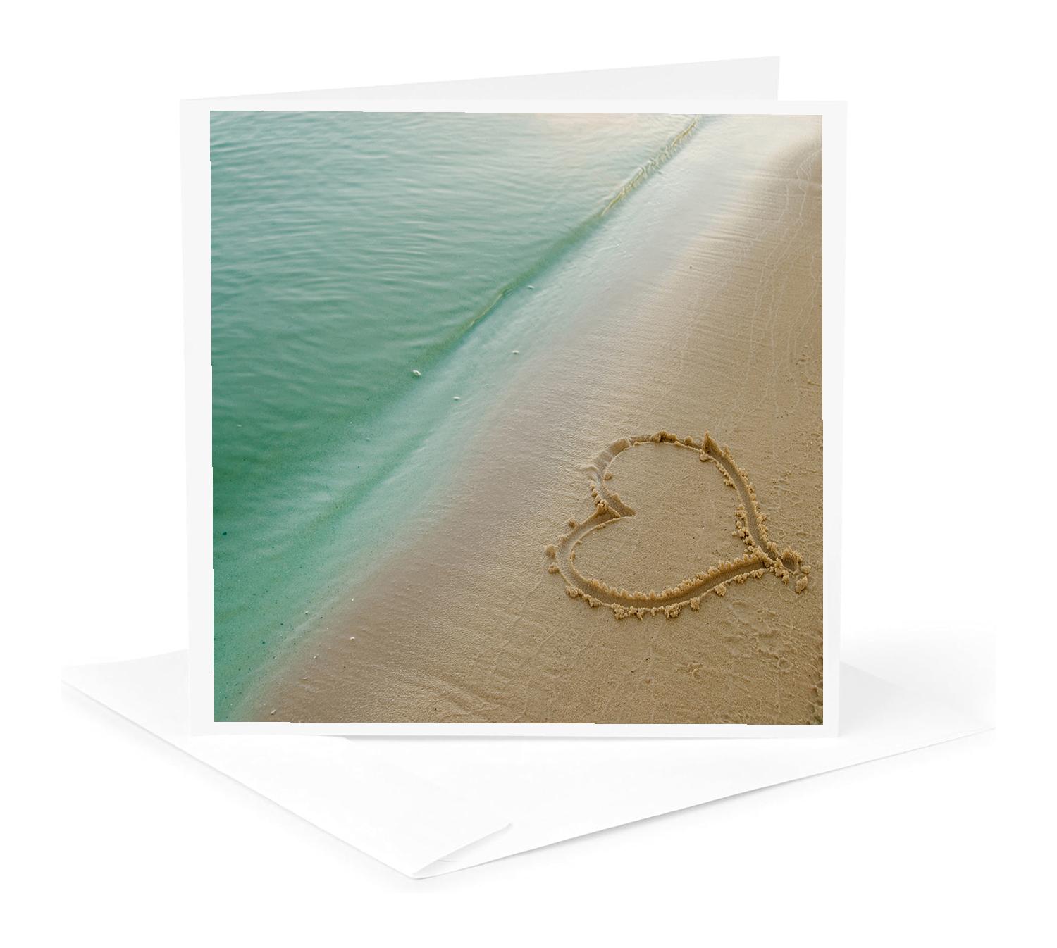 3dRose Island Swag Designs Love Theme - Heart Shape Symbolizing Love, Heart Carved in Sand on the Beach - Greeting Cards (gc_173299)