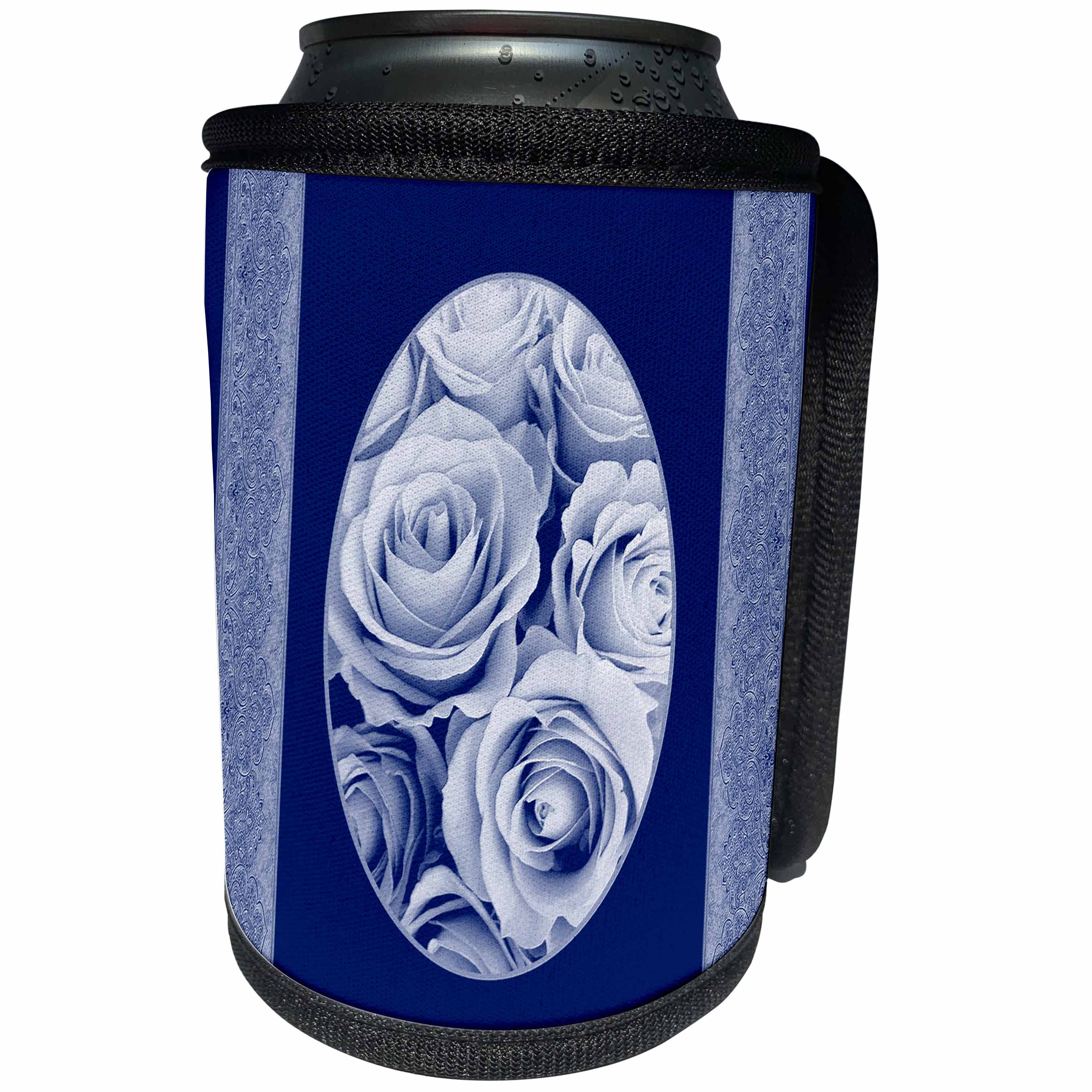 3dRose Jaclinart Garden Nature Florals Flowers Roses Vintage Damask - Pale blue roses in oval frame on navy blue background surrounded by damask ribbons - Can Cooler Bottle Wrap (cc_29885)