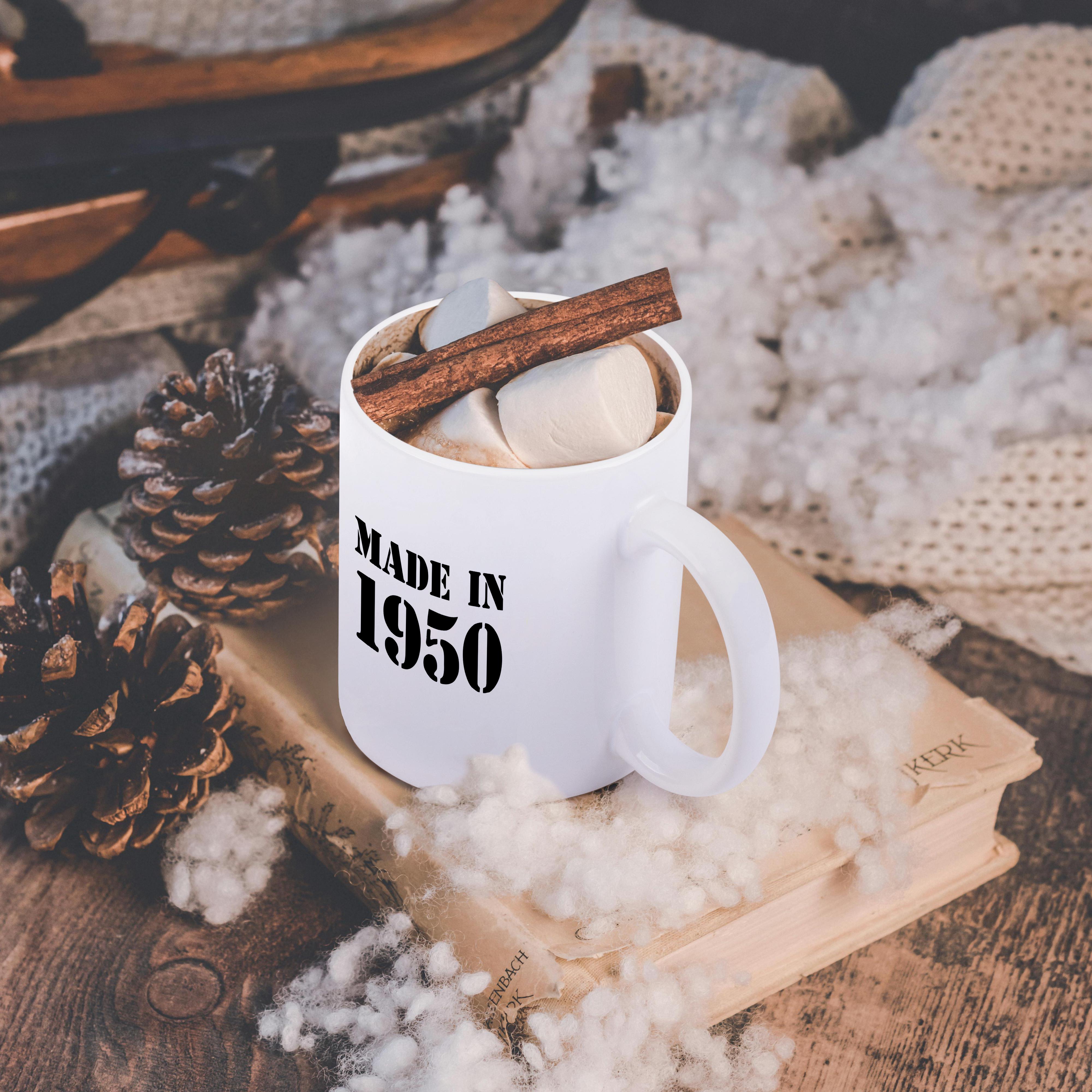 3dRose Made in 1950 - funny birthday birth year text - fun black bday stamp... - Mugs (mug_162716)