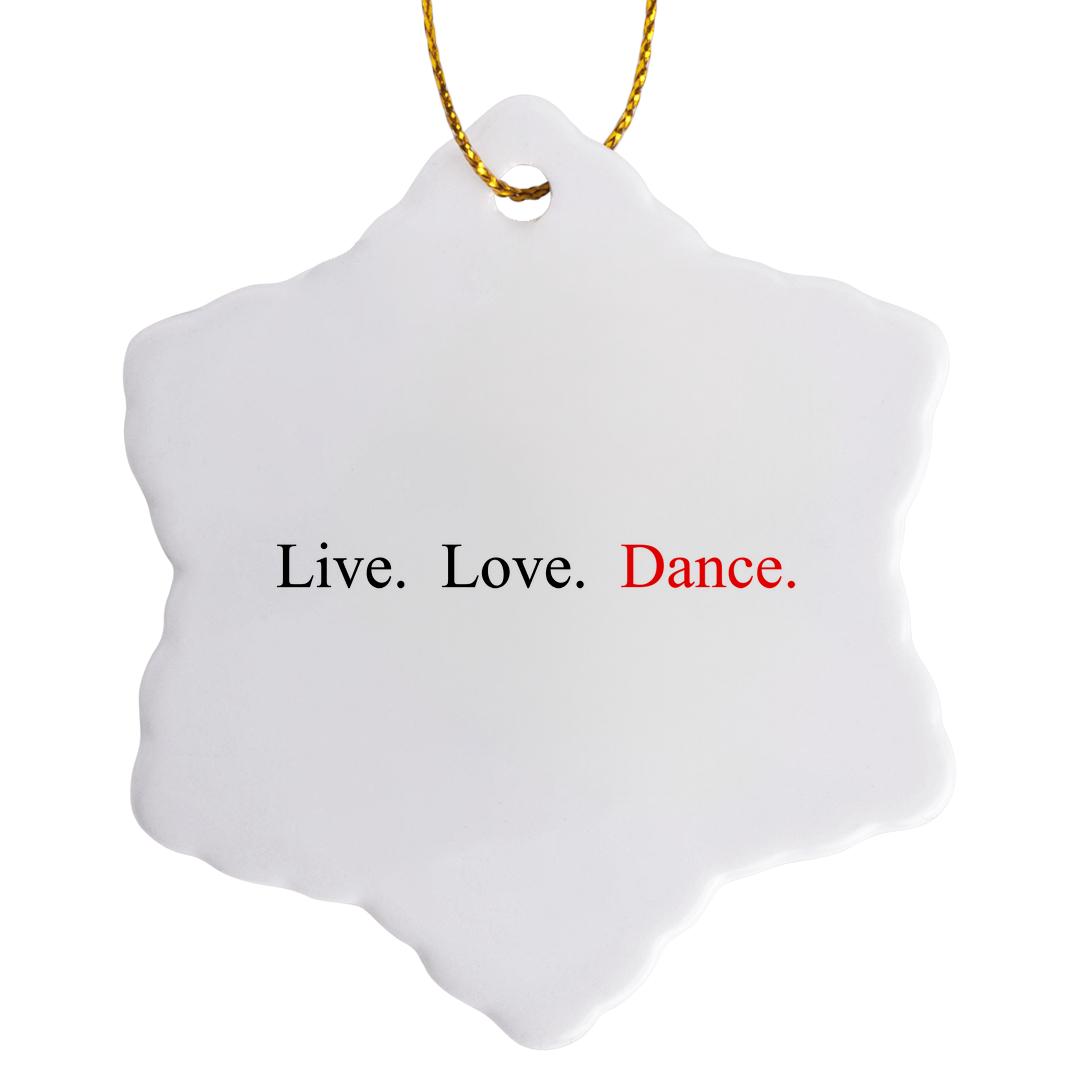 Live, Love, Dance Ornament is a perfect addition to your tree or as a window decoration. This glossy porcelain ornament is a great gift for family and friends, commemorating each holiday or special occasion. Image printed on both sides; measures 3 inches. A strand of gold thread makes it easy to display this fantastic keepsake.