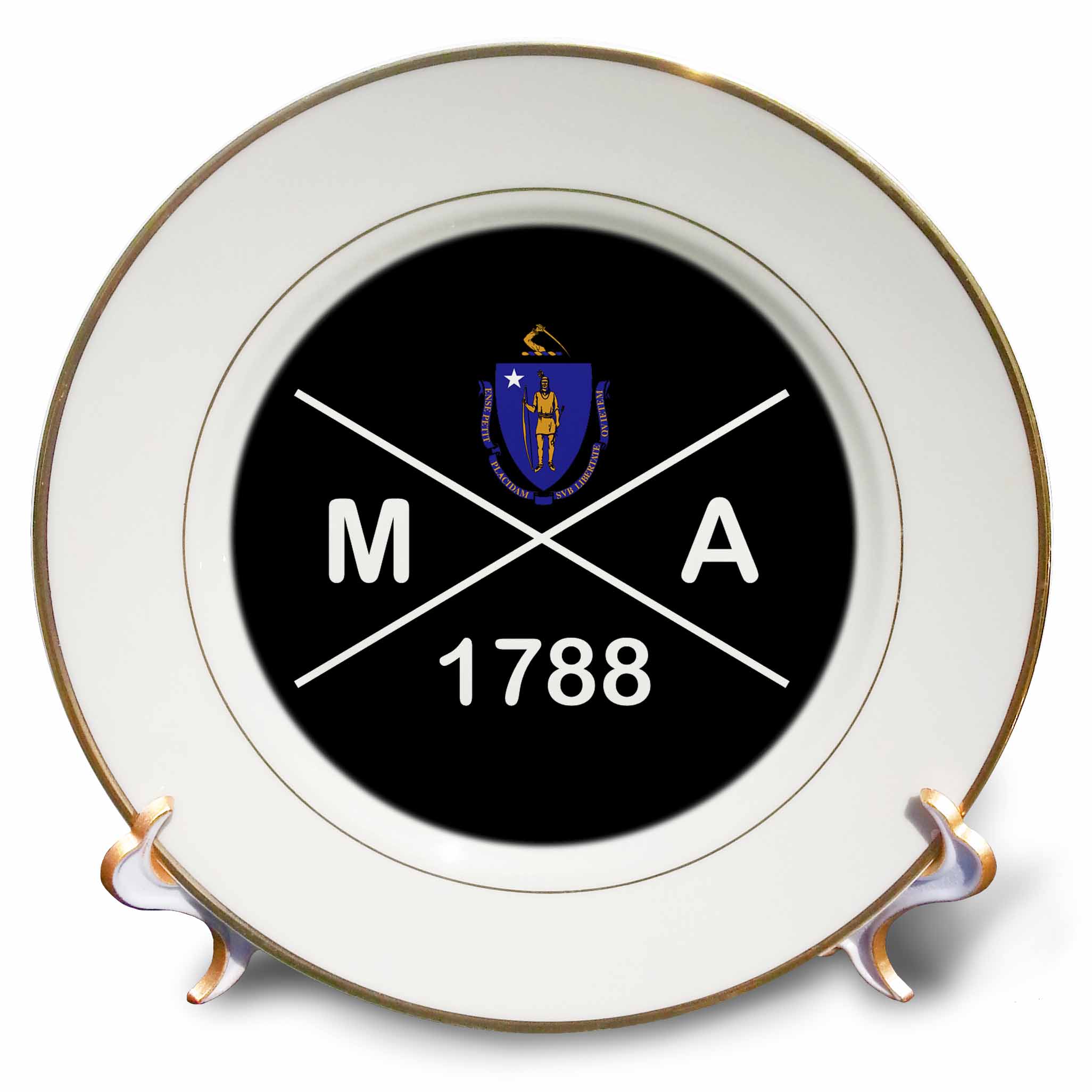Massachusetts state abbreviation, statehood, and flag art on black. Plate is 7.5" in diameter. Made of white porcelain featuring two 24k gold rims. Excellent to give as a gift commemorating a special person or event. Stand included. Decorative use only.