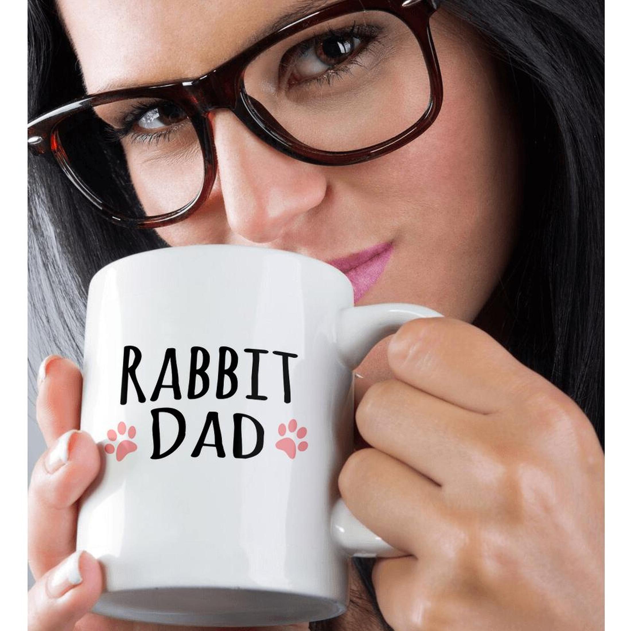 Rabbit Dad - for bunny rabbit lovers and pet owners - with pink paw prints Mug is available in both 11 oz and 15 oz. Why drink out of an ordinary mug when a custom printed mug is so much cooler? This ceramic mug is lead free, microwave safe. Image is printed on both sides. Hand washing is recommended.