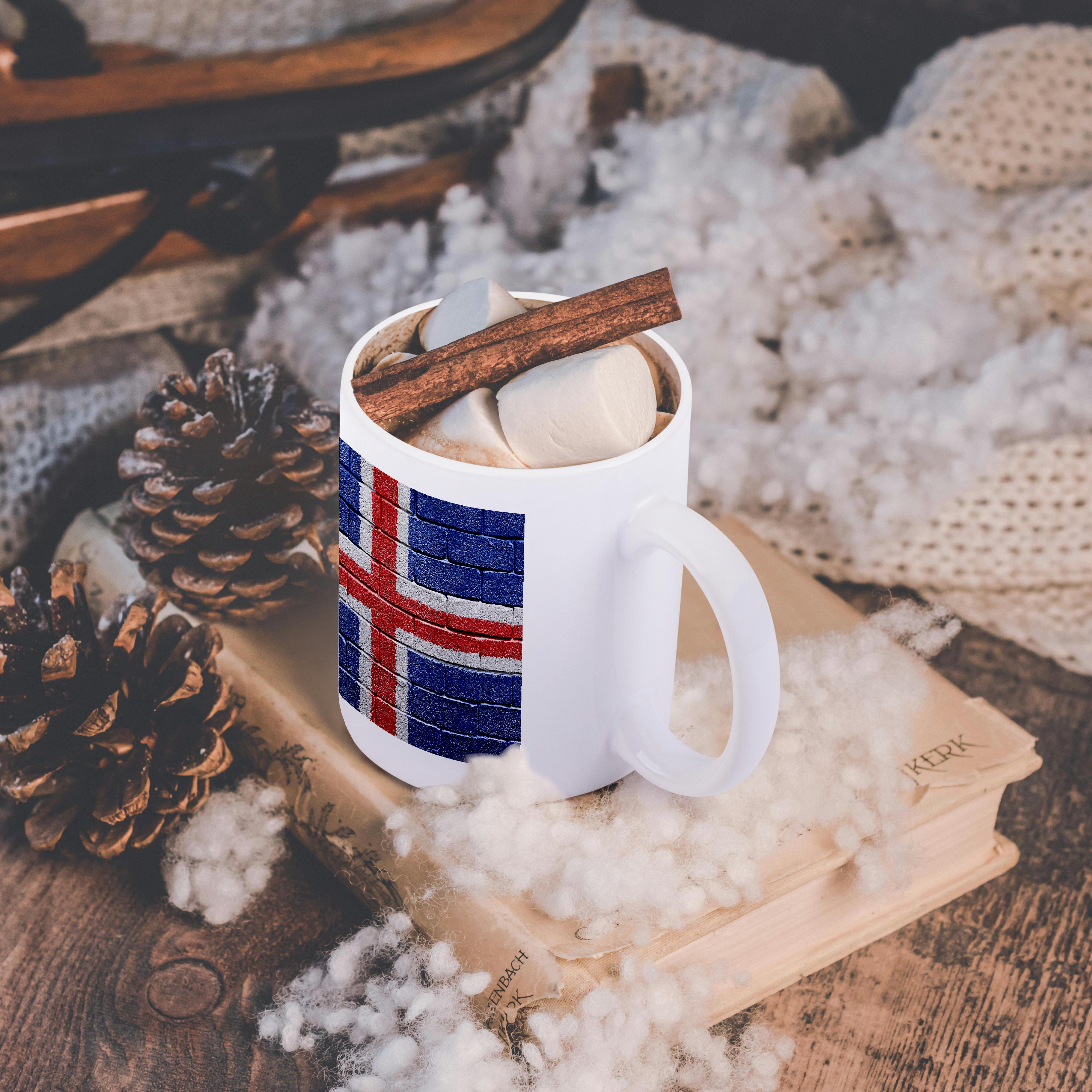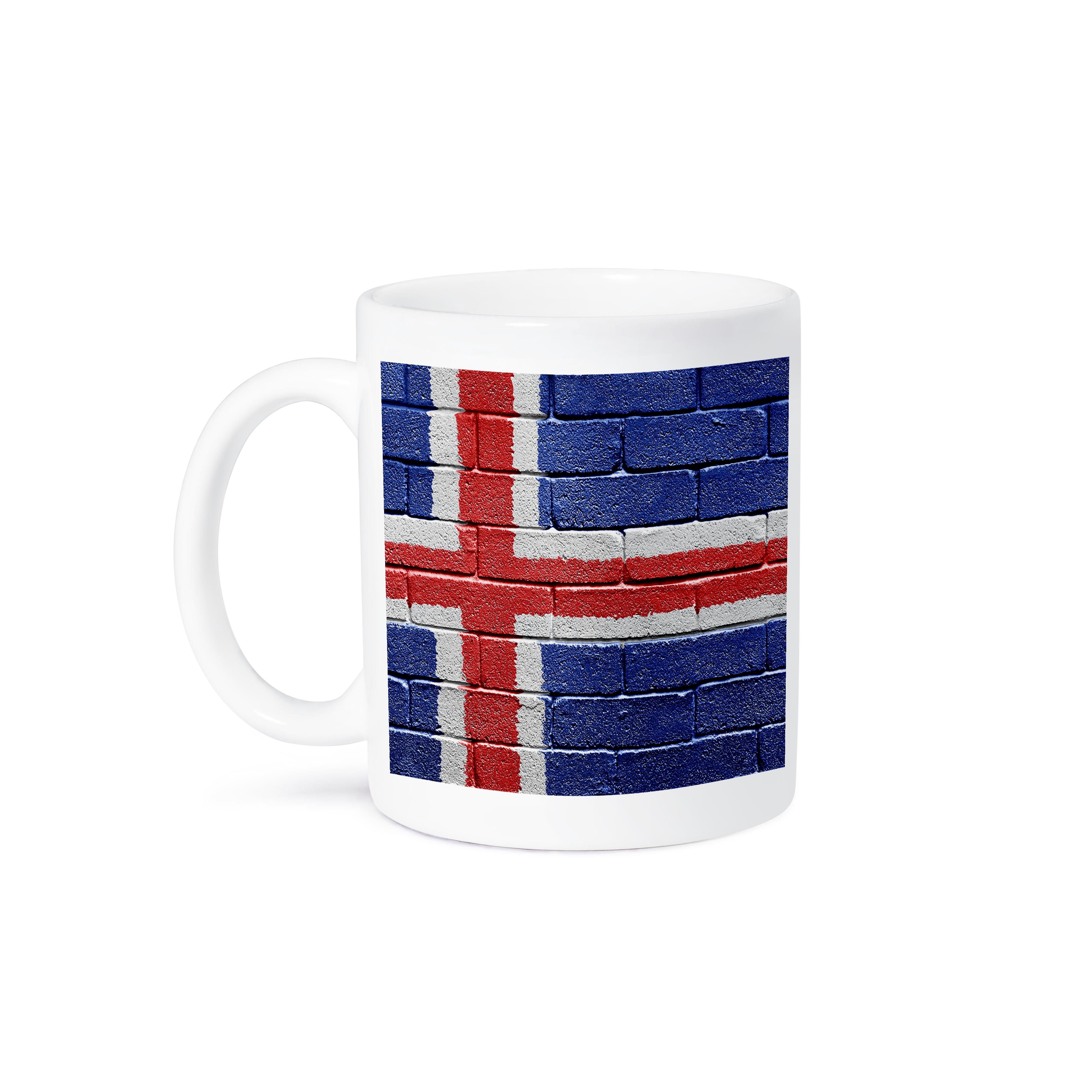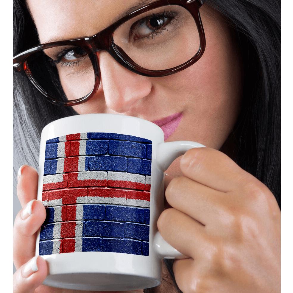 National flag of Iceland painted onto a brick wall Icelandic Mug is available in both 11 oz and 15 oz. Why drink out of an ordinary mug when a custom printed mug is so much cooler? This ceramic mug is lead free, microwave safe. Image is printed on both sides. Hand washing is recommended.