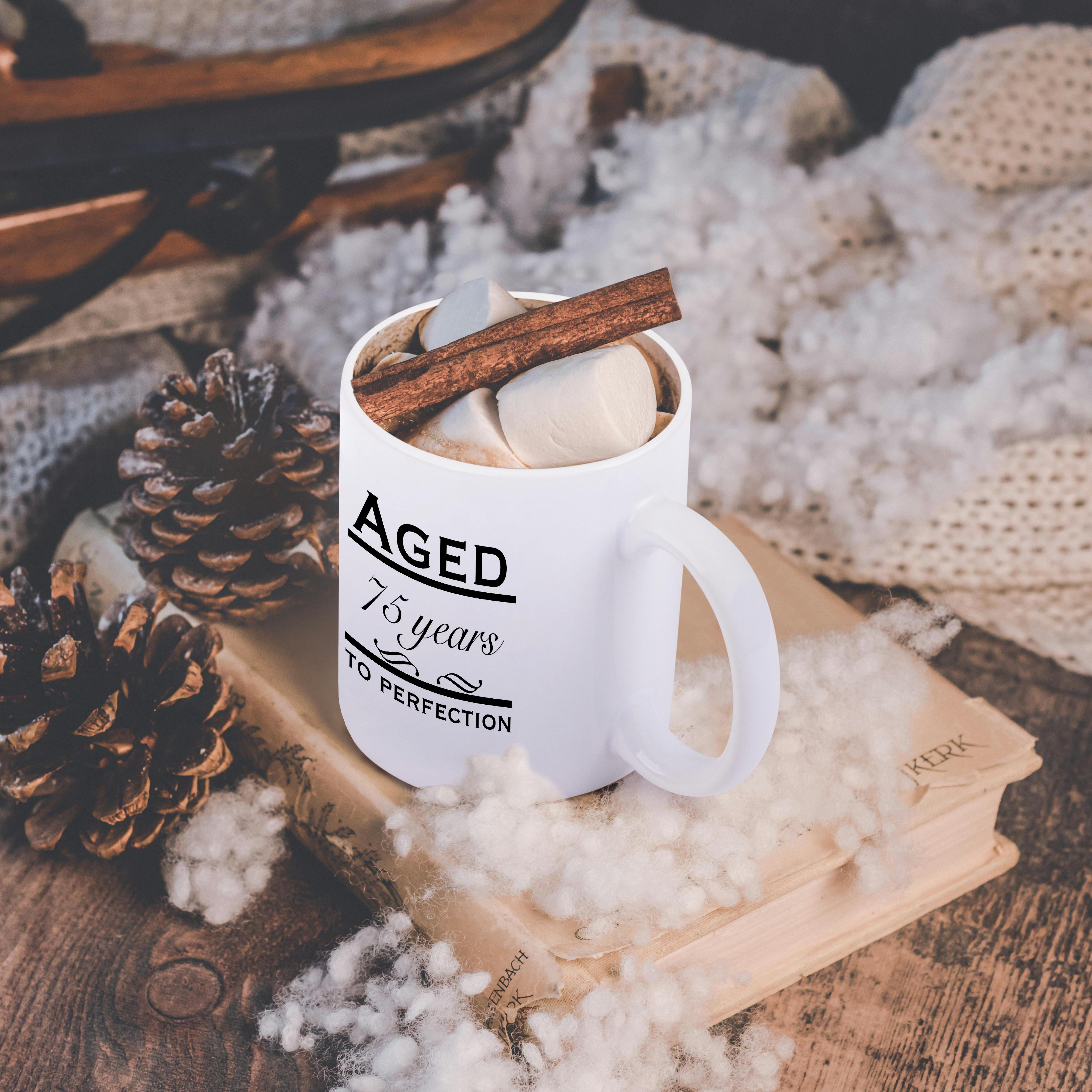 Aged 75 years to perfection Mug is available in both 11 oz and 15 oz. Why drink out of an ordinary mug when a custom printed mug is so much cooler? This ceramic mug is lead free, microwave safe. Image is printed on both sides. Hand washing is recommended.