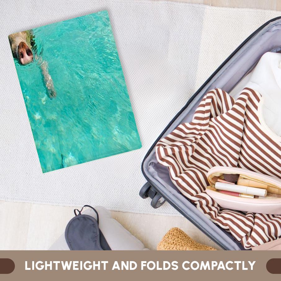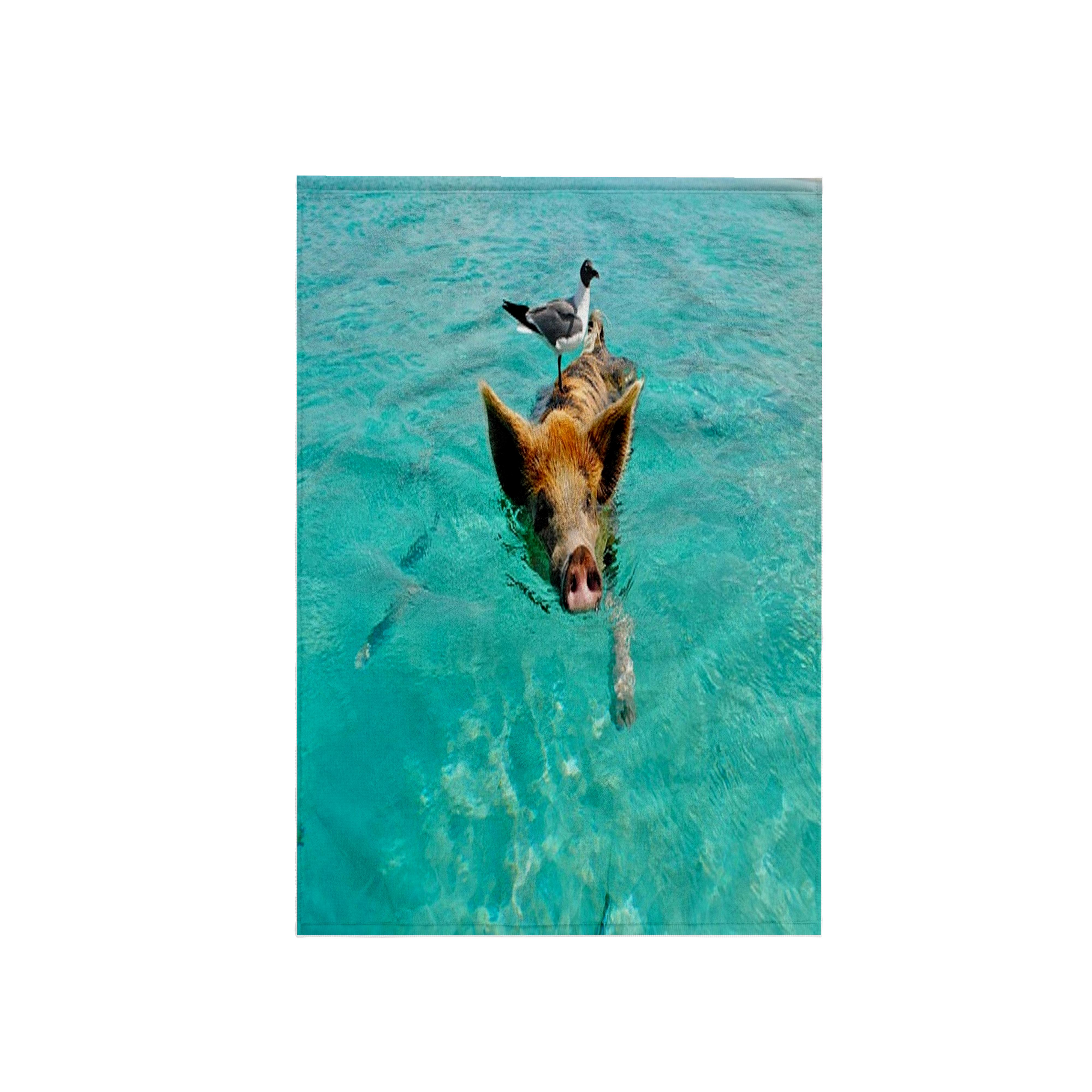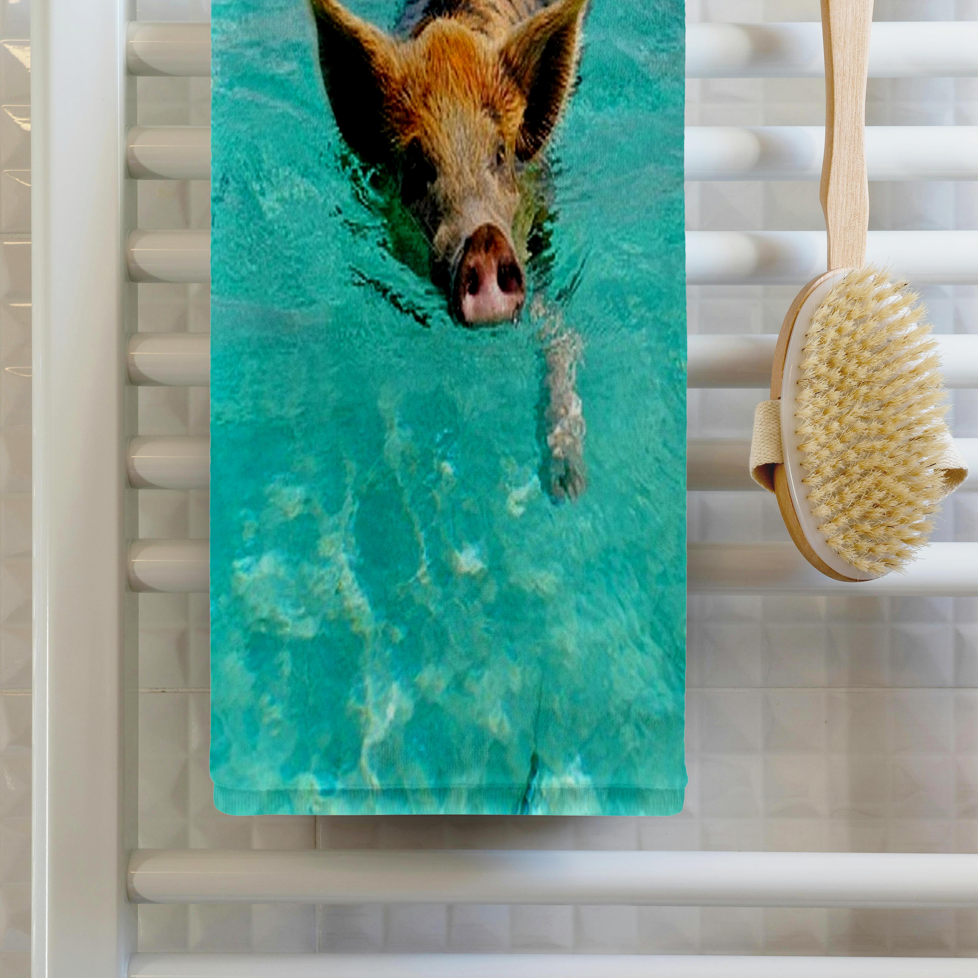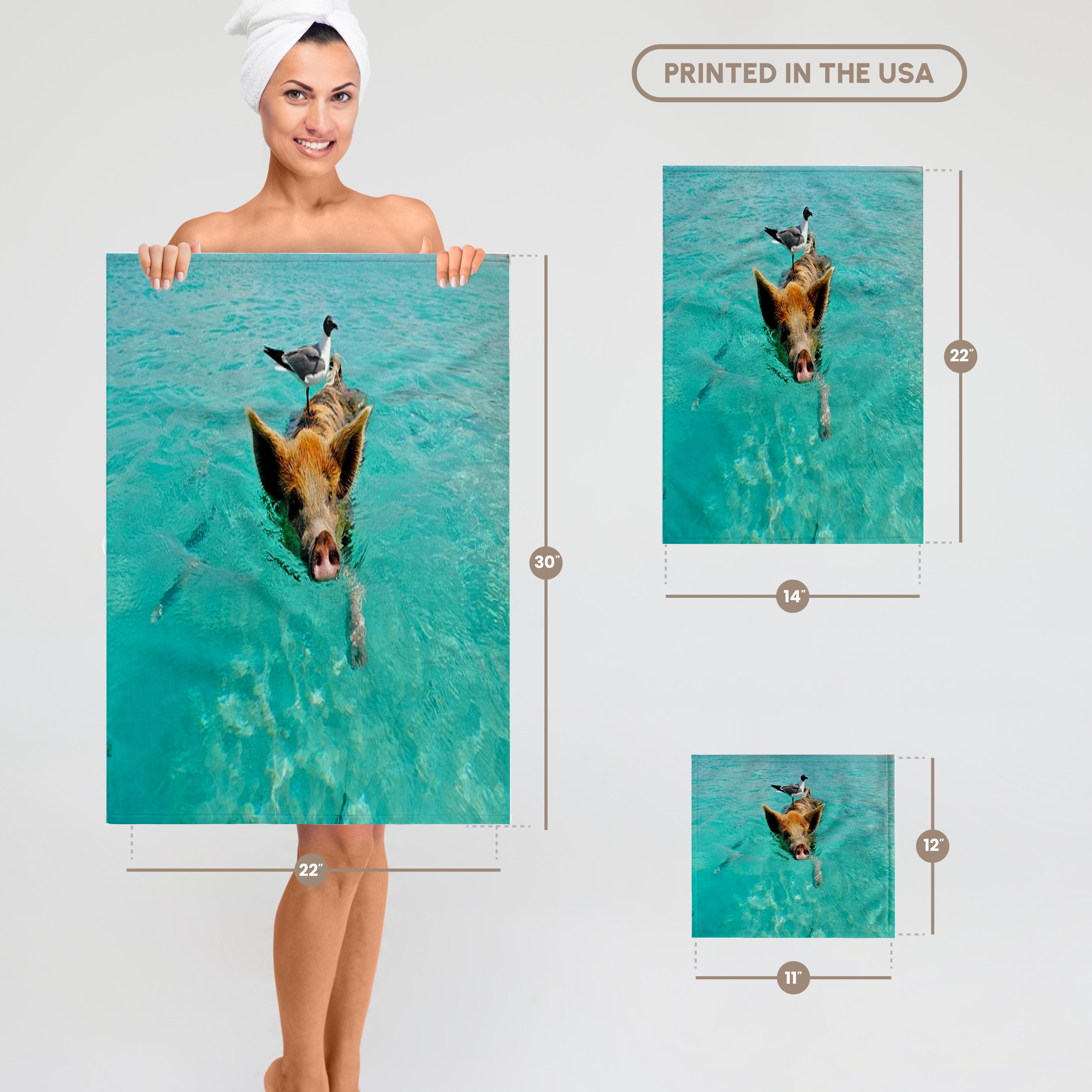 Print of Swimming Pig In Staniel Cay Bahamas Towel is great to use in the kitchen, bathroom or gym. This 15 by 22 inch, hand/sports towel allows you to customize your room with a special design or color. Great for drying dishes, hands and faces. Suitable to put in any sports bag. Image will not fade after washing. Machine wash, tumble dry low, do not bleach. Towel will regain its fullness after the first washing. Made of: Printed side 100% polyester and reverse side 100% Terrycloth cotton. Image printed on polyester side/ terry cloth side is blank white.