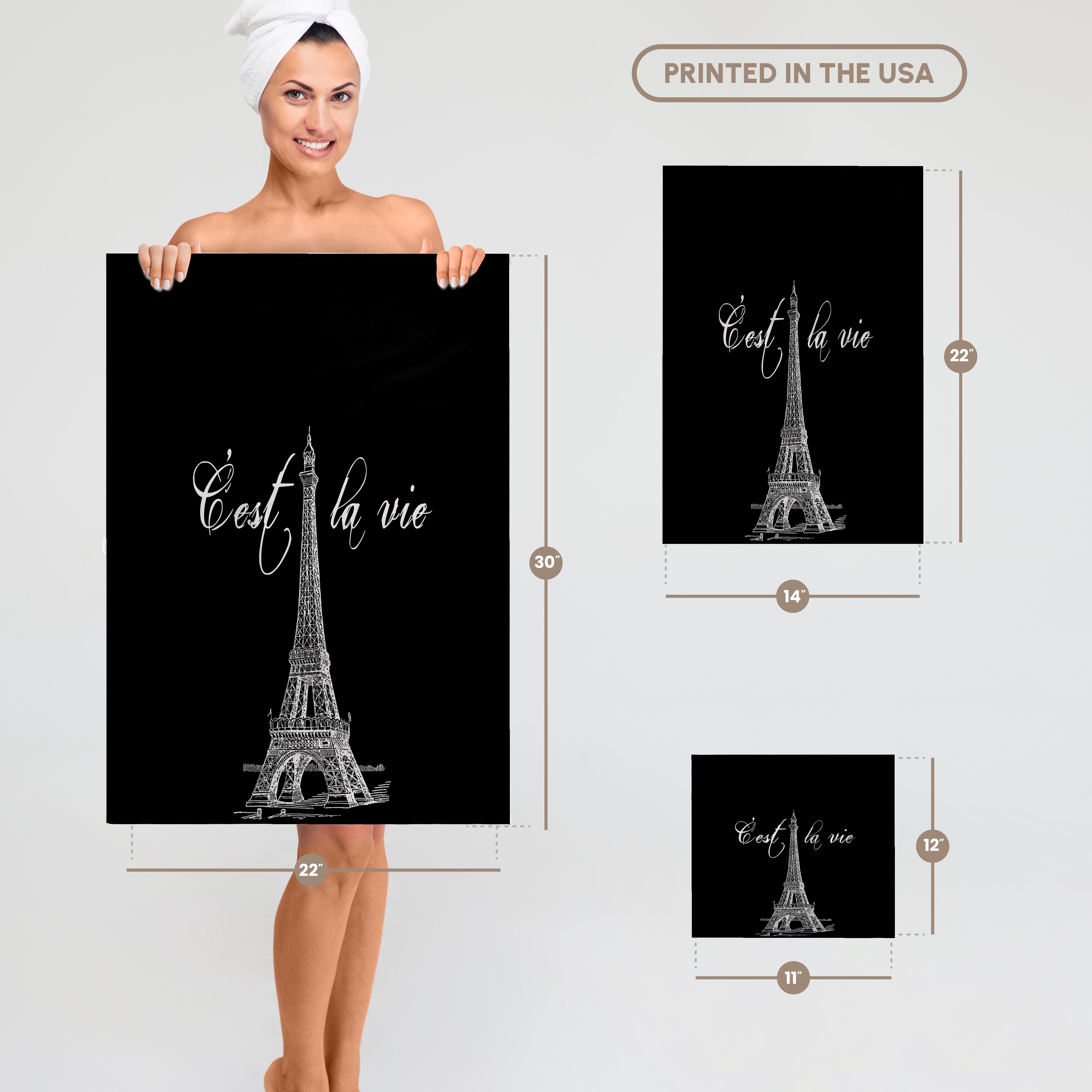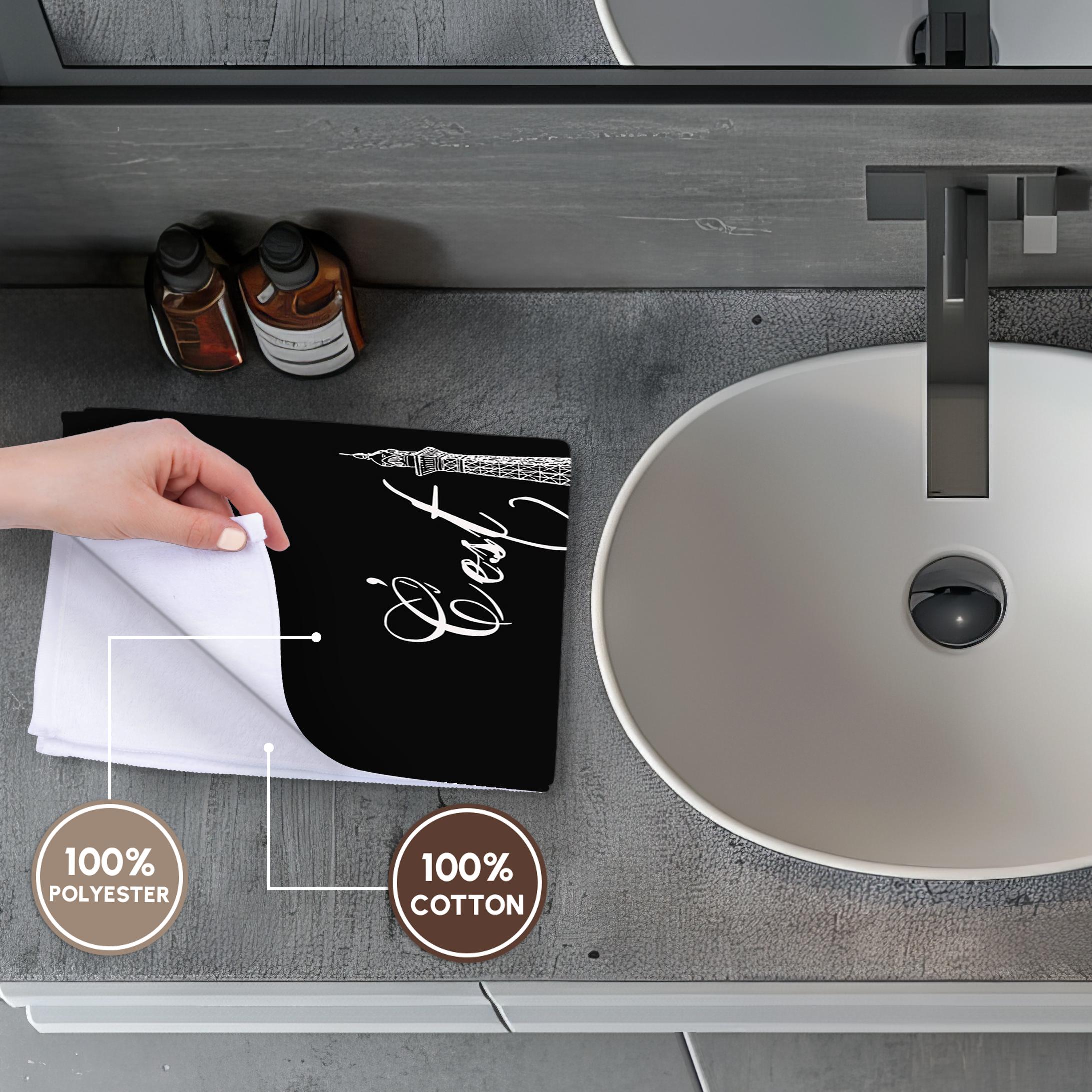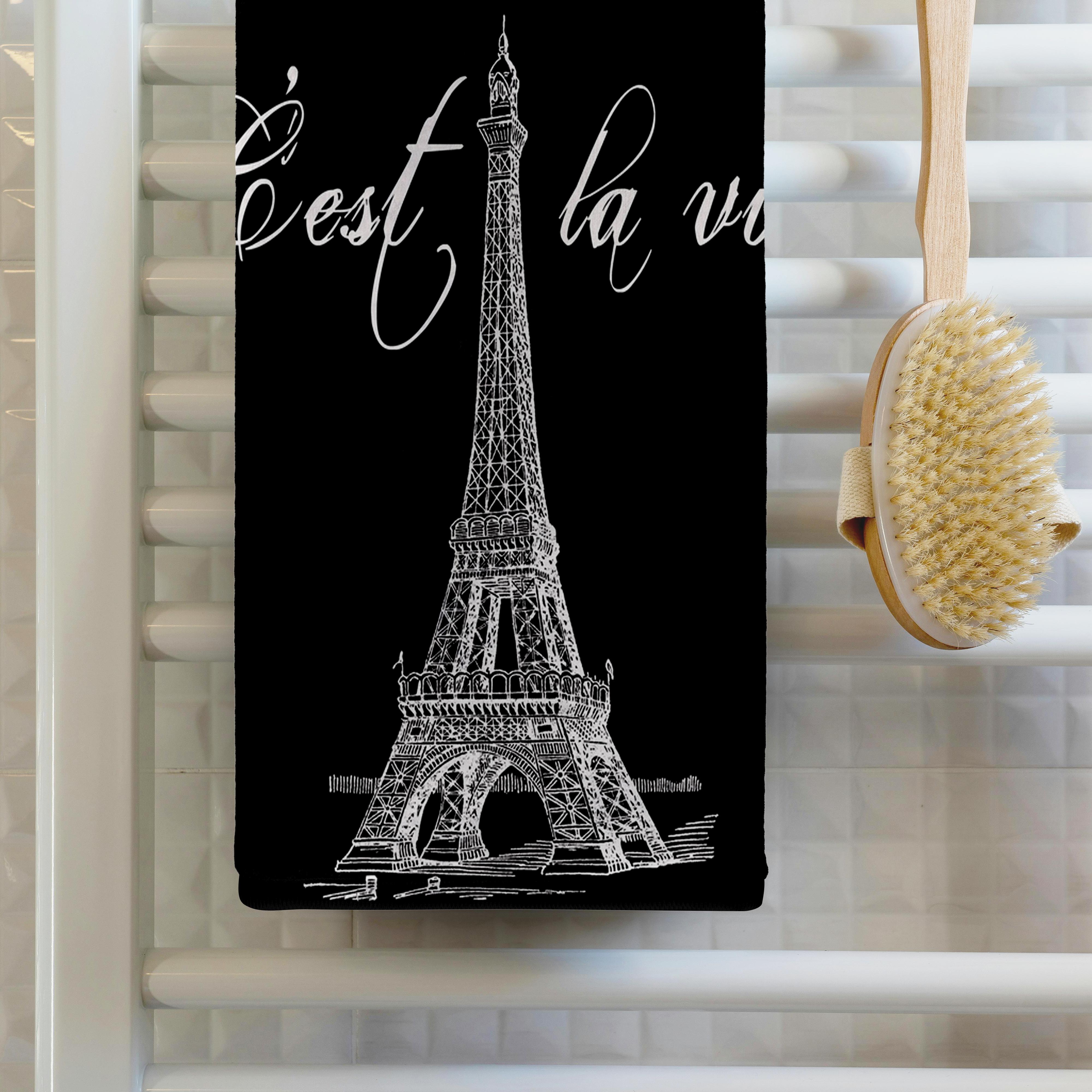 French black and white Eiffel Tower Towel is great to use in the kitchen, bathroom or gym. This 15 by 22 inch, hand/sports towel allows you to customize your room with a special design or color. Great for drying dishes, hands and faces. Suitable to put in any sports bag. Image will not fade after washing. Machine wash, tumble dry low, do not bleach. Towel will regain its fullness after the first washing. Made of: Printed side 100% polyester and reverse side 100% Terrycloth cotton. Image printed on polyester side/ terry cloth side is blank white.