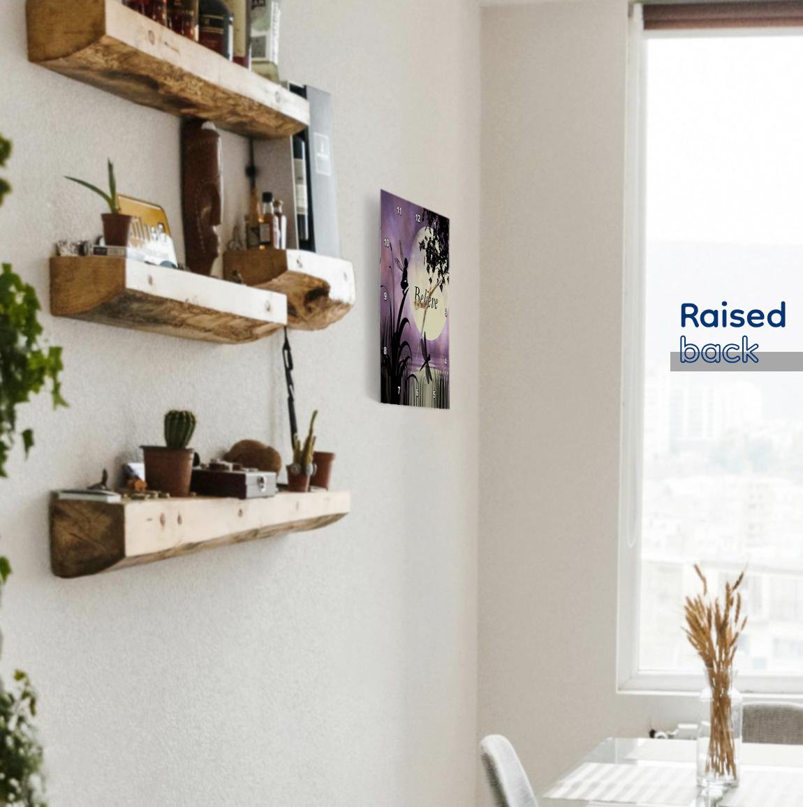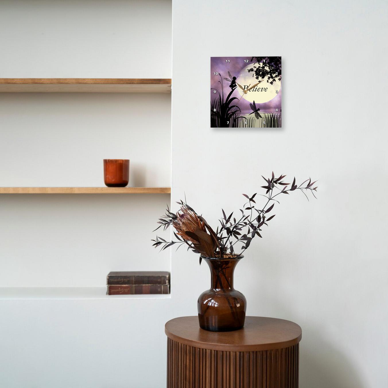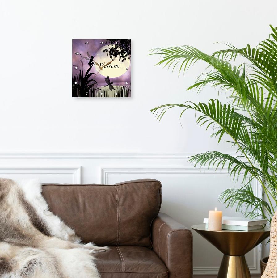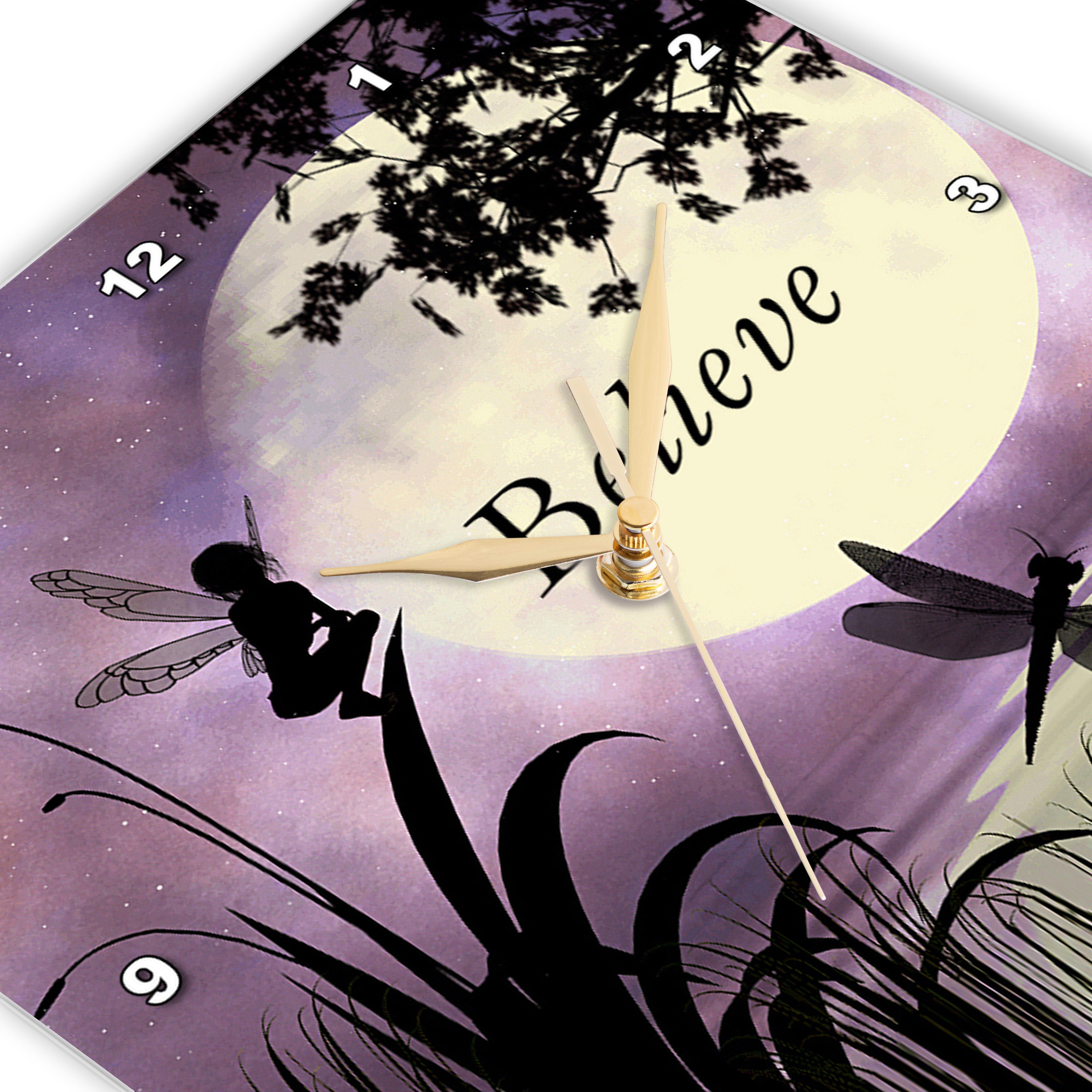 3dRose Renderly Yours Fairies - Believe, Fairy with Dragonflies with Moon and Purple Sky - Wall Clocks (DPP_35696)