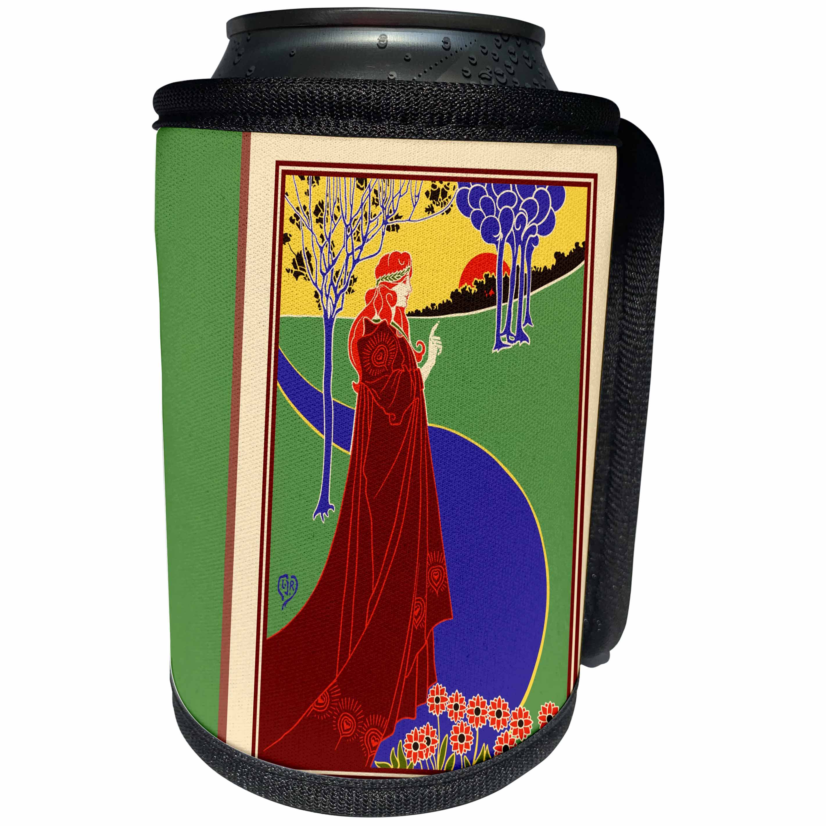 3dRose Russ Billington Designs - Pretty Art Nouveau Redhead Girl with red peacock feather dress - Can Cooler Bottle Wrap (cc_219262)