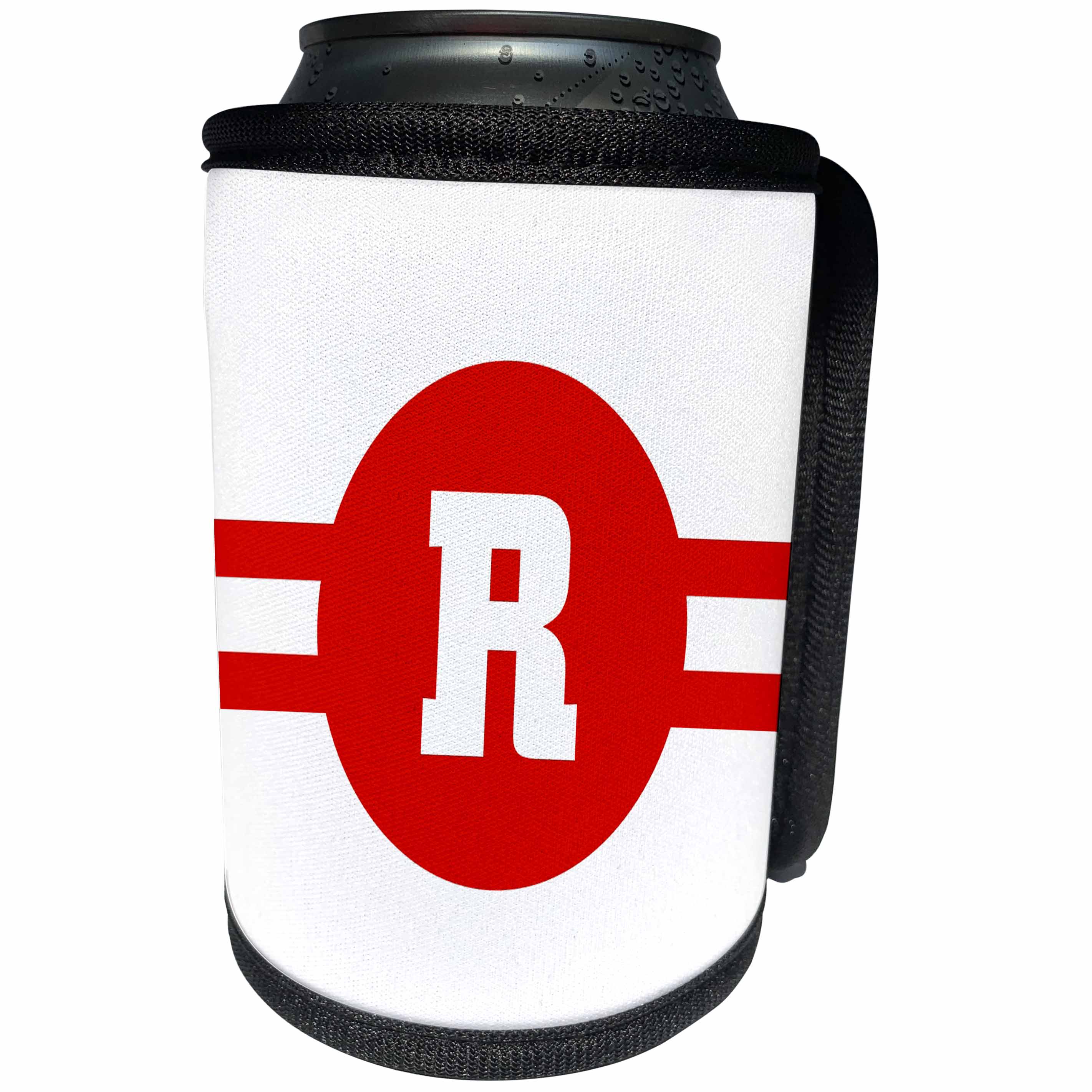 3dRose Russ Billington Monograms- Sports- Initial R - Initial R- Sports Monogram Roundel and Stripes in Red and White - Can Cooler Bottle Wrap (cc_299157)