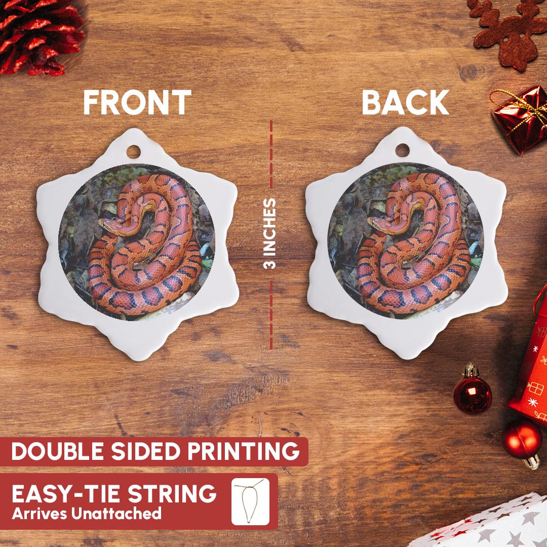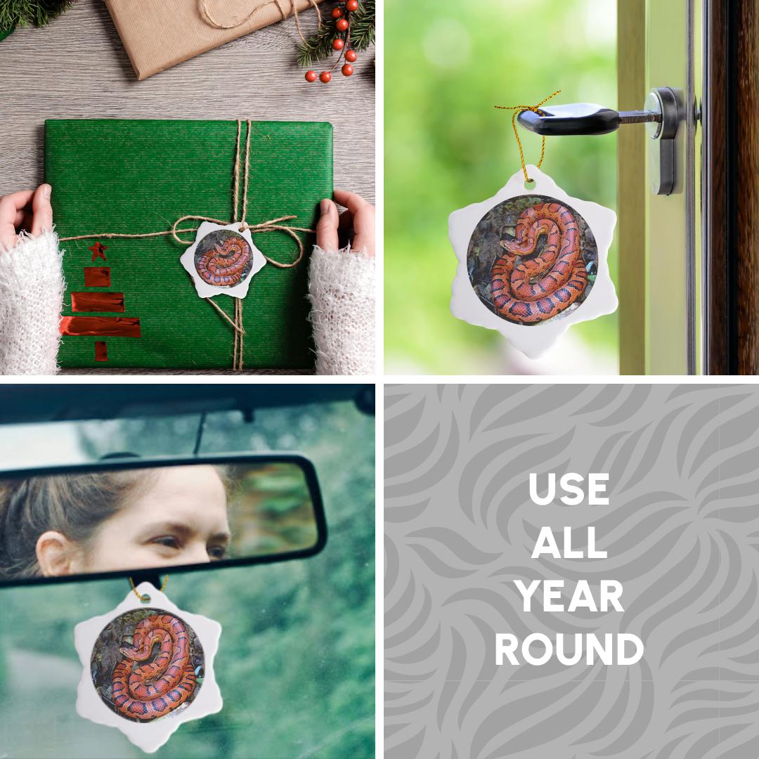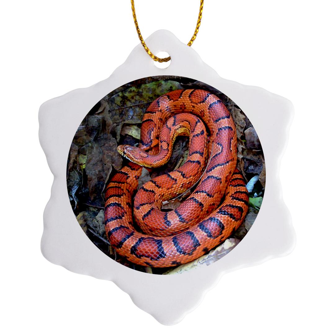 CORN SNAKE Ornament is a perfect addition to your tree or as a window decoration. This glossy porcelain ornament is a great gift for family and friends, commemorating each holiday or special occasion. Image printed on both sides; measures 3 inches. A strand of gold thread makes it easy to display this fantastic keepsake.