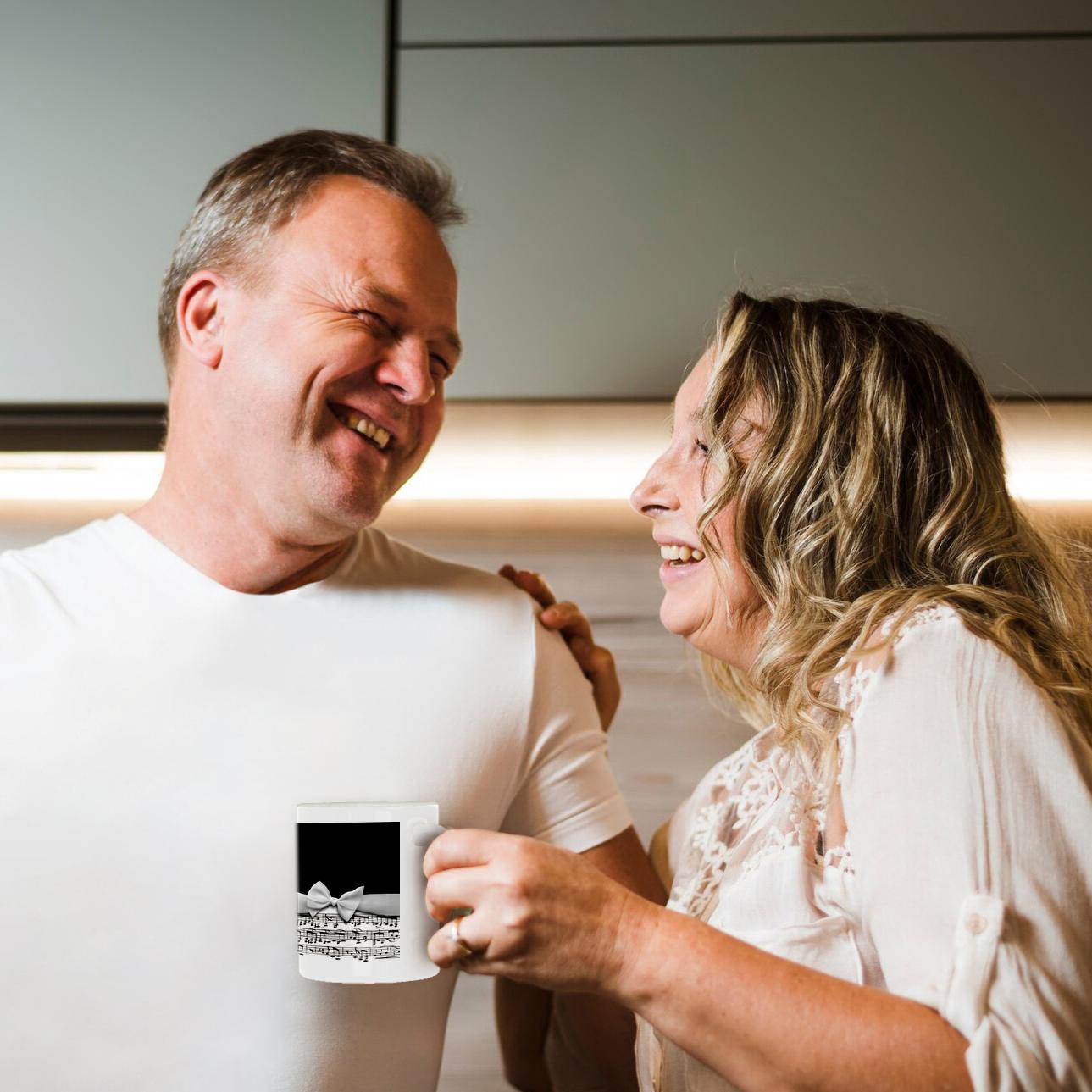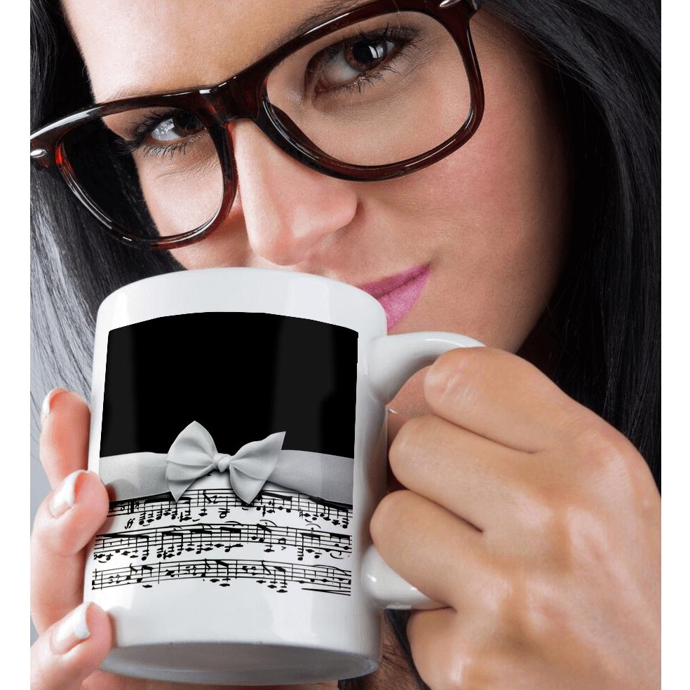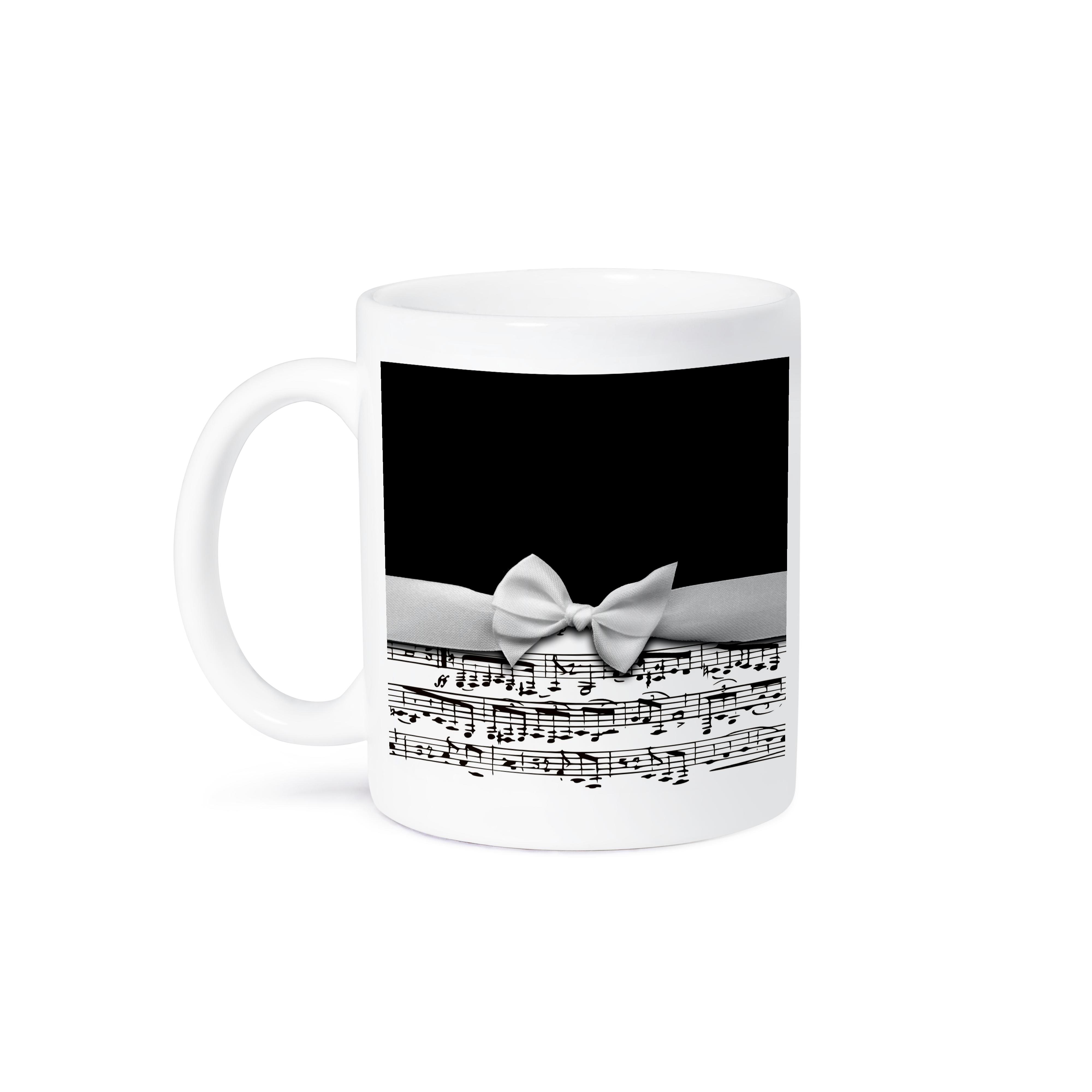 3dRose Stylish musical notes faux ribbon and bow - black and white sheet music... - Mugs (mug_123130)