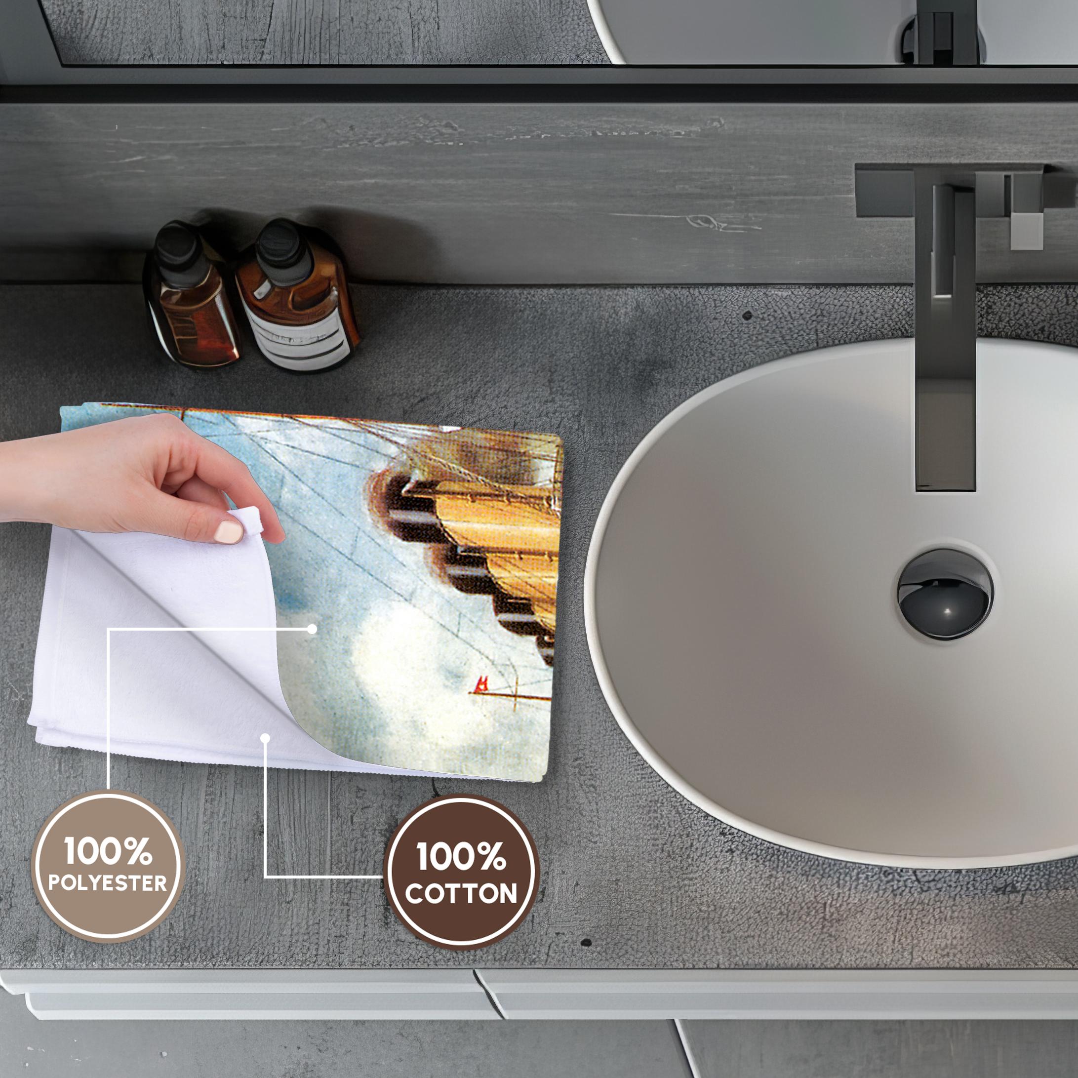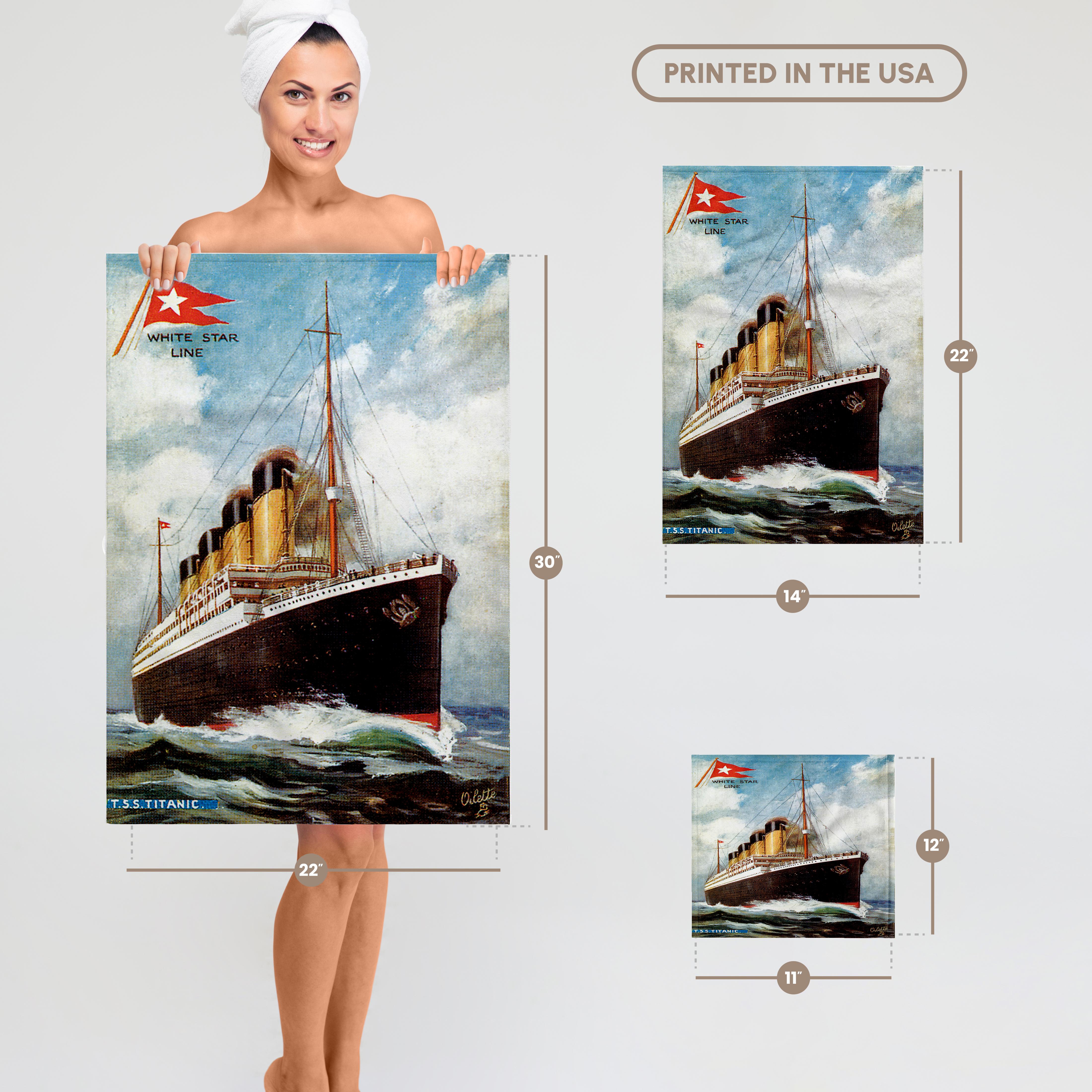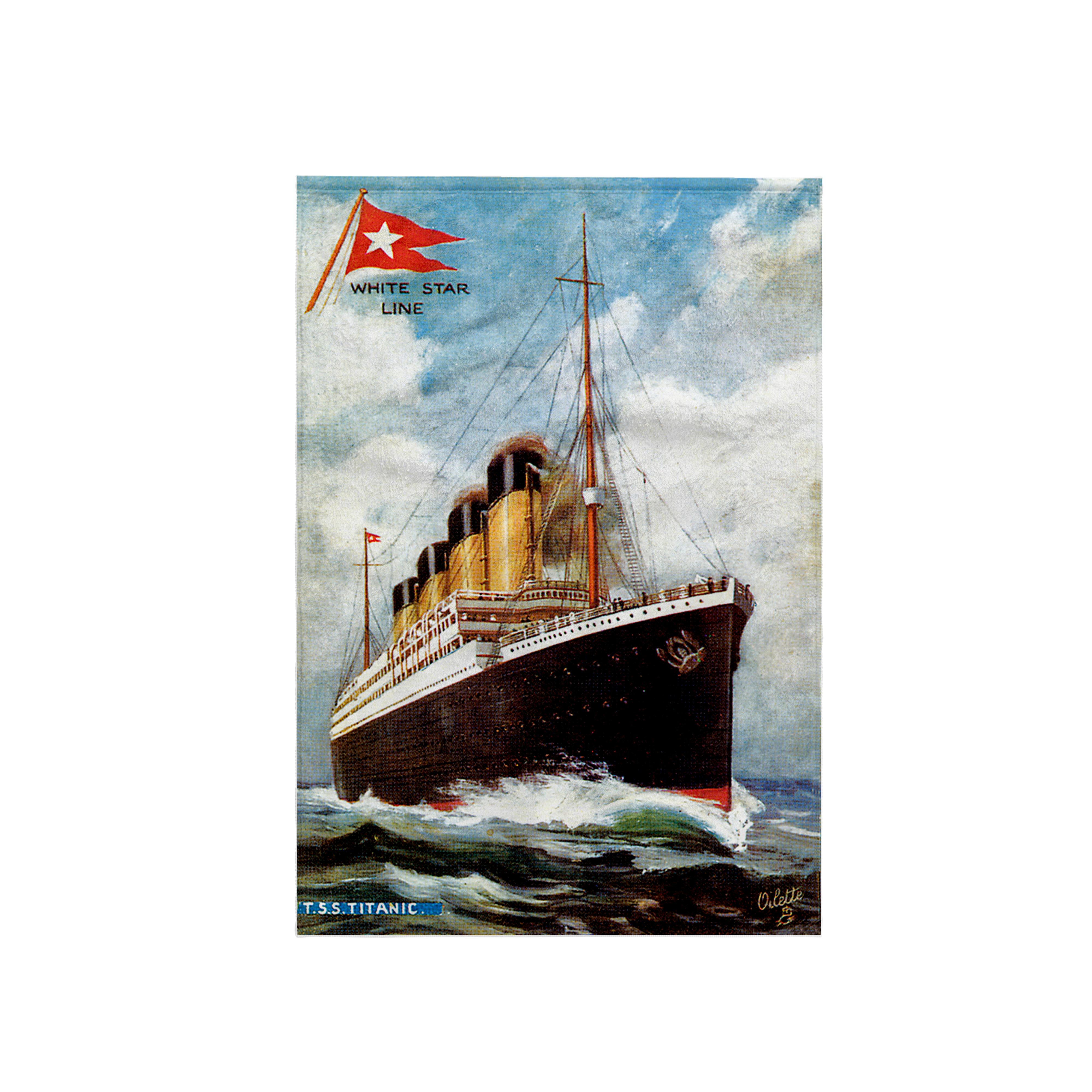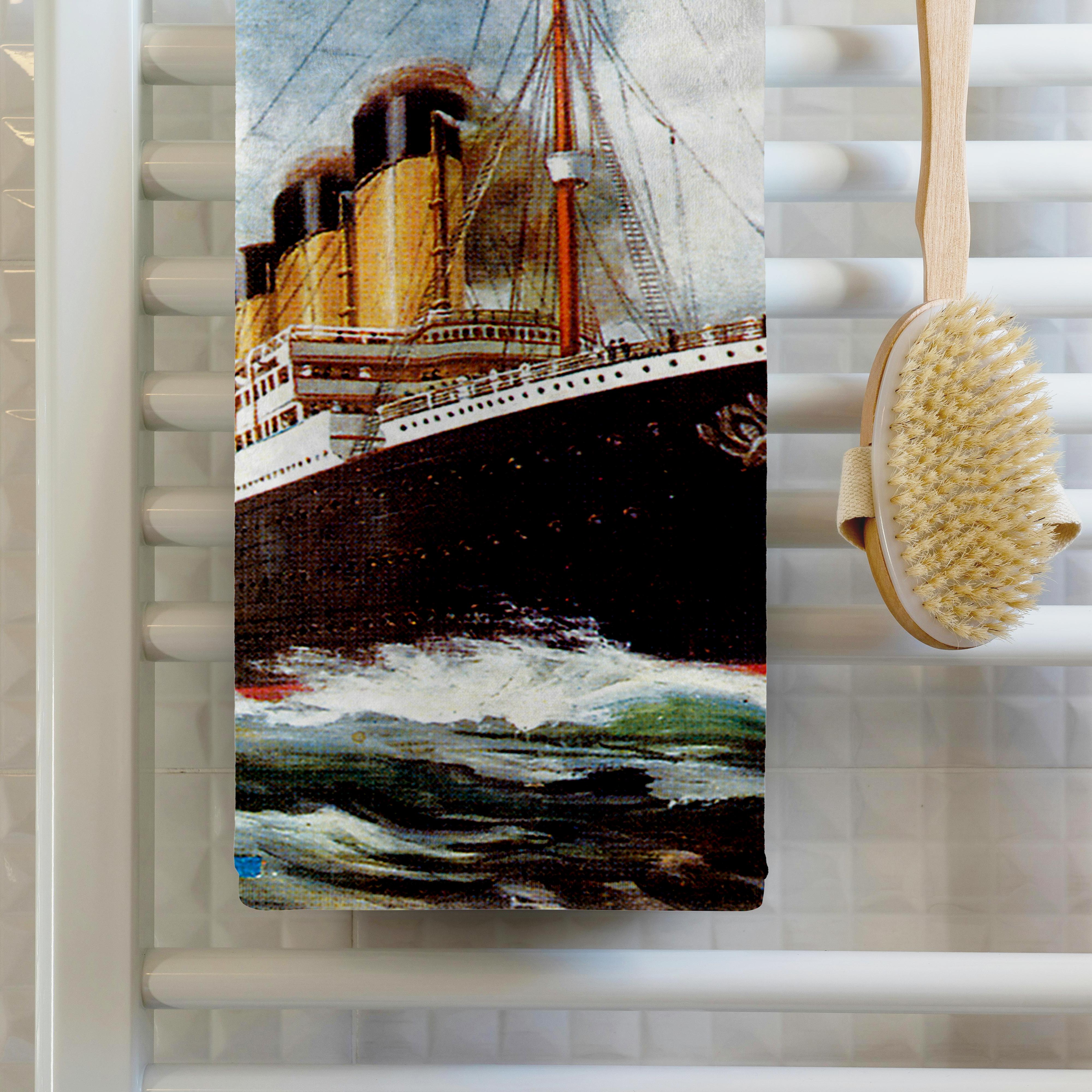 Vintage White Star Line S.S. Titanic Towel is great to use in the kitchen, bathroom or gym. This 15 by 22 inch, hand/sports towel allows you to customize your room with a special design or color. Great for drying dishes, hands and faces. Suitable to put in any sports bag. Image will not fade after washing. Machine wash, tumble dry low, do not bleach. Towel will regain its fullness after the first washing. Made of: Printed side 100% polyester and reverse side 100% Terrycloth cotton. Image printed on polyester side/ terry cloth side is blank white.