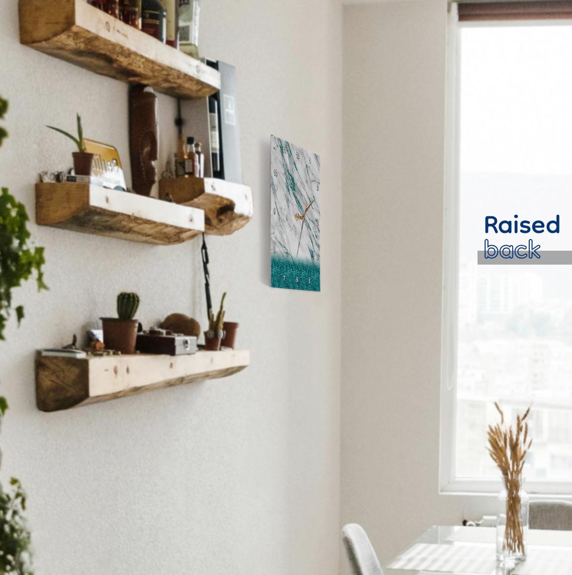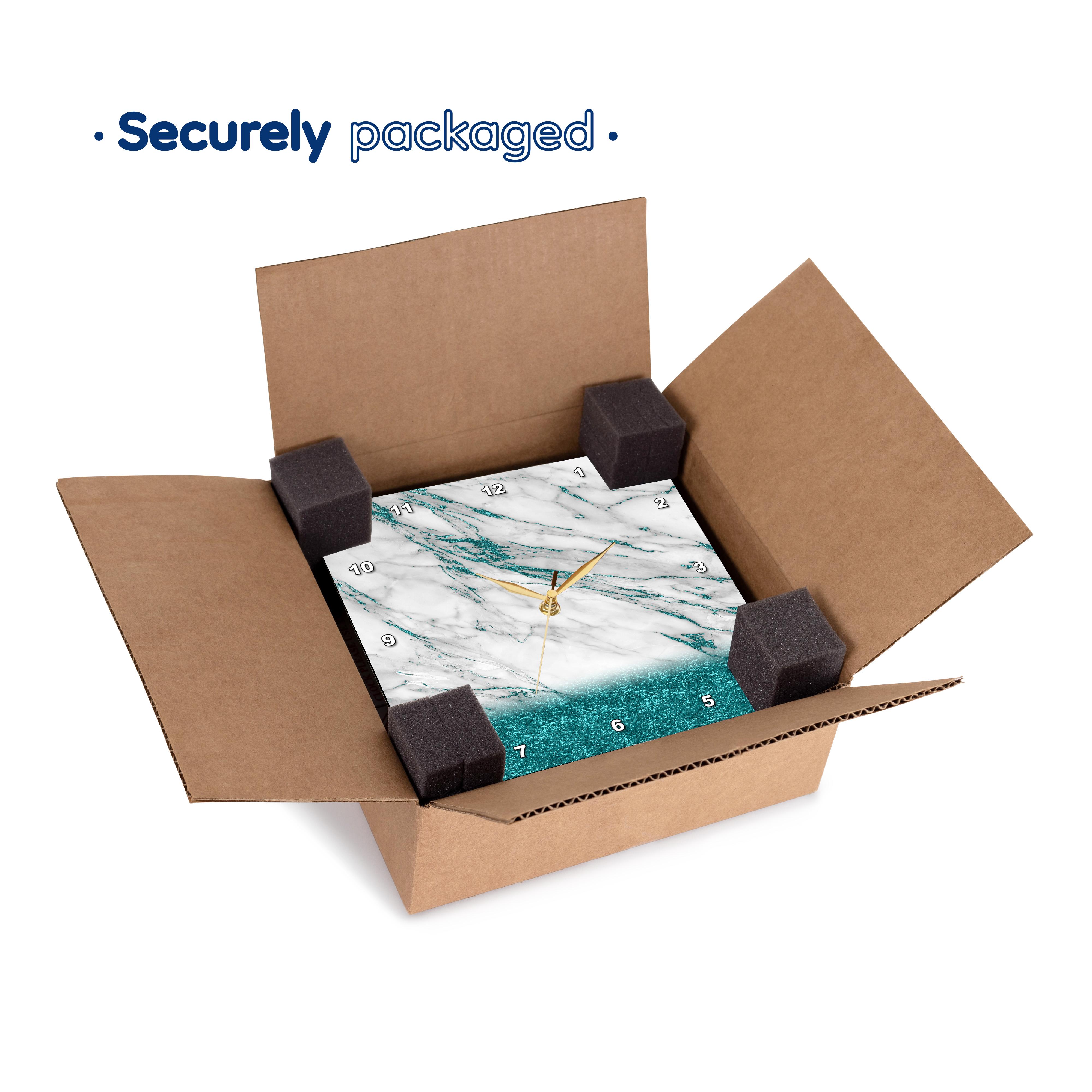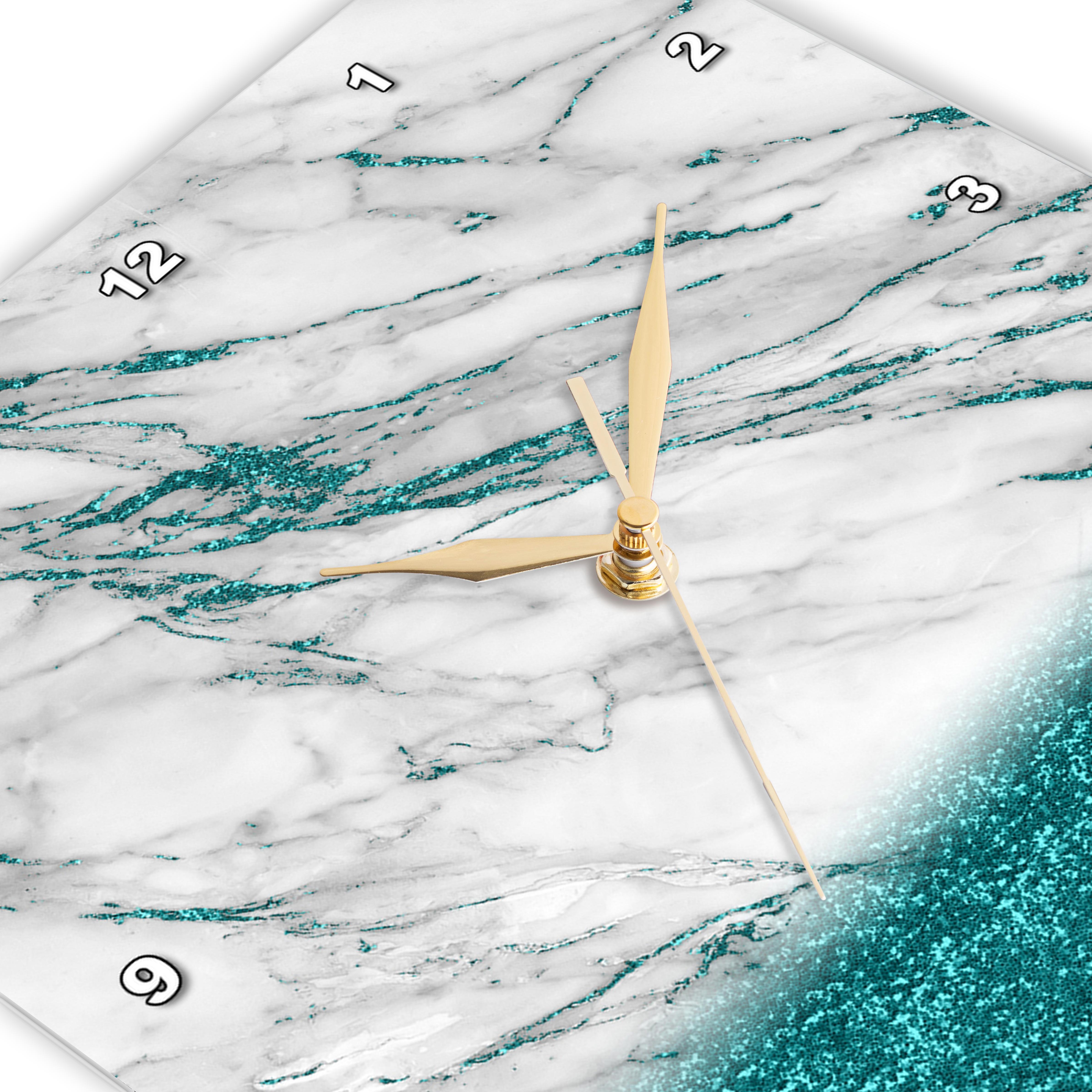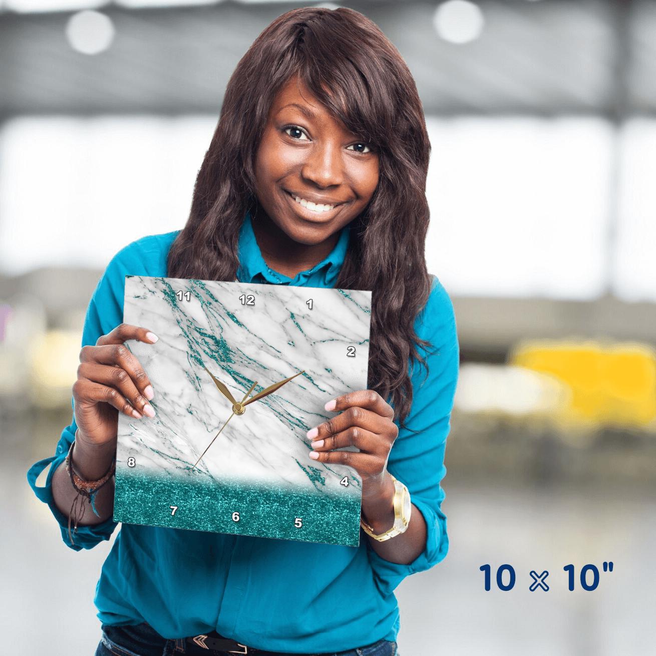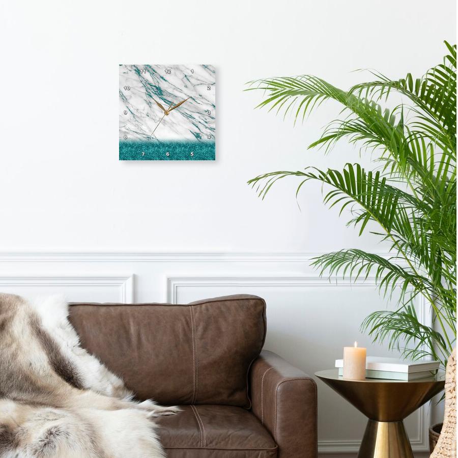Luxury Grey Aqua Teal Gem Stone Marble Glitter Metallic Faux Print Wall Clock is a wonderful complement to any room in your home or office. Made of durable high grade aluminum. This frame-less clock has a high gloss mirror like, UV coated, scratch resistant finish and is suitable for a moist environment. Sizes available range from 10" x 10" to 15" x 15". Requires one AA battery; not included. Battery box is not covered. Made in USA.