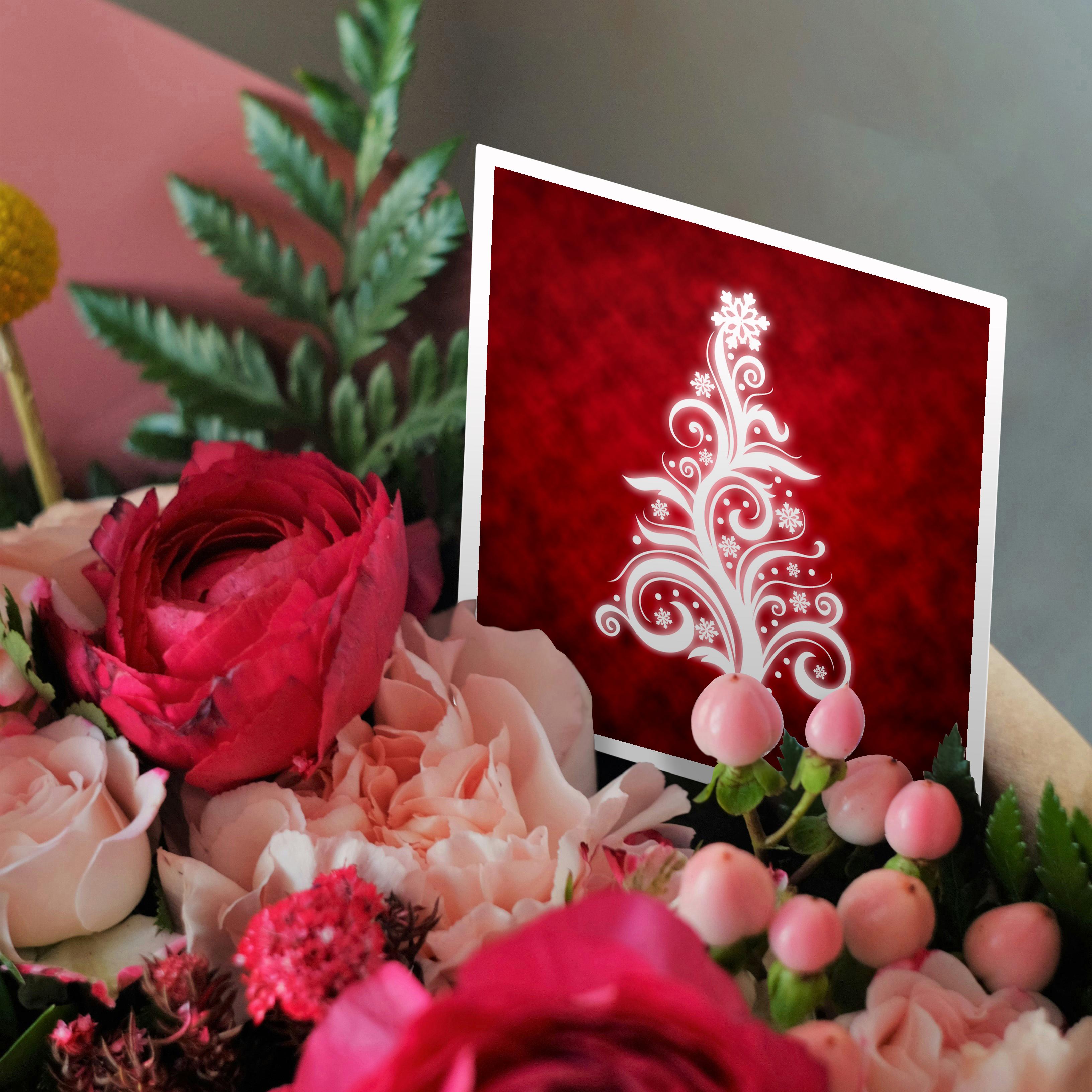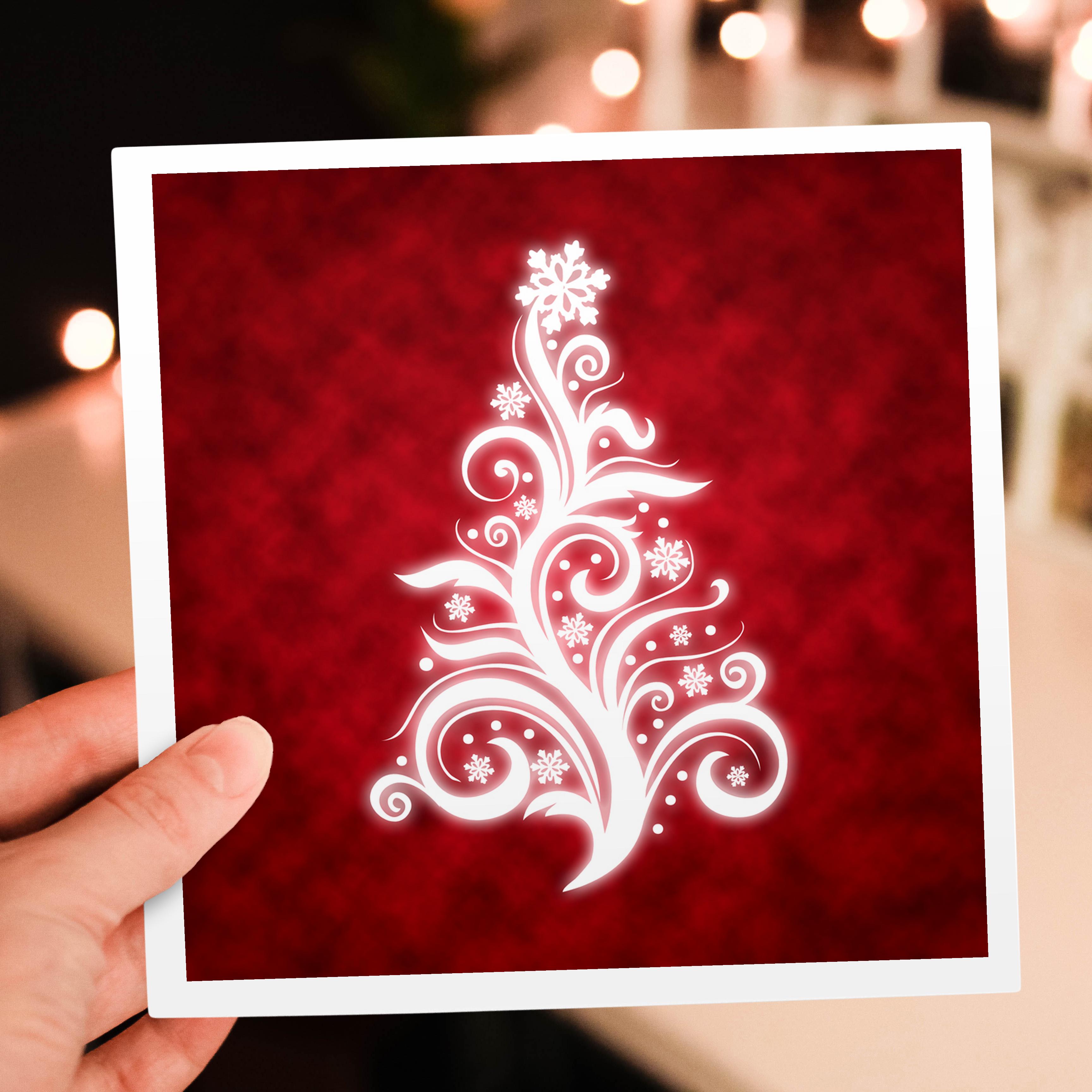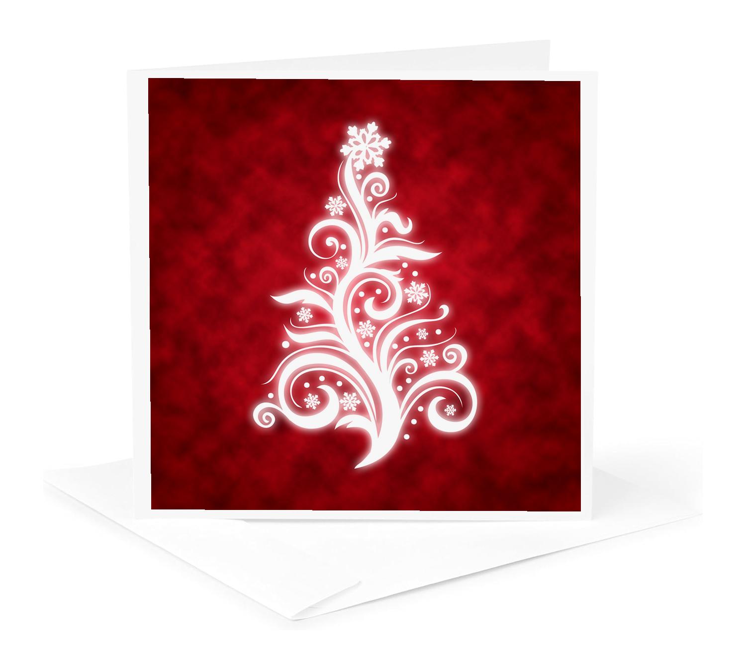 Swirly Christmas Tree on red Greeting Card is a great way to say "thank you" or to acknowledge any occasion. These blank cards are made of heavy-duty card stock that allows for smudge free writing. Cards are creased for easy folding and come with white envelopes. Available individually or in sets of 6 and 12. Made in USA.